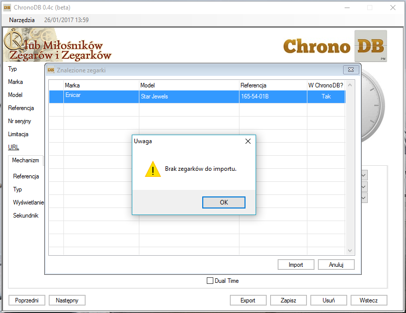 Ponadto w momencie importu do czystej bazy pojedynczych plików xml z zegarkami dostałem taki komunikat (Win10 ze wszystkimi aktualizacjami)
