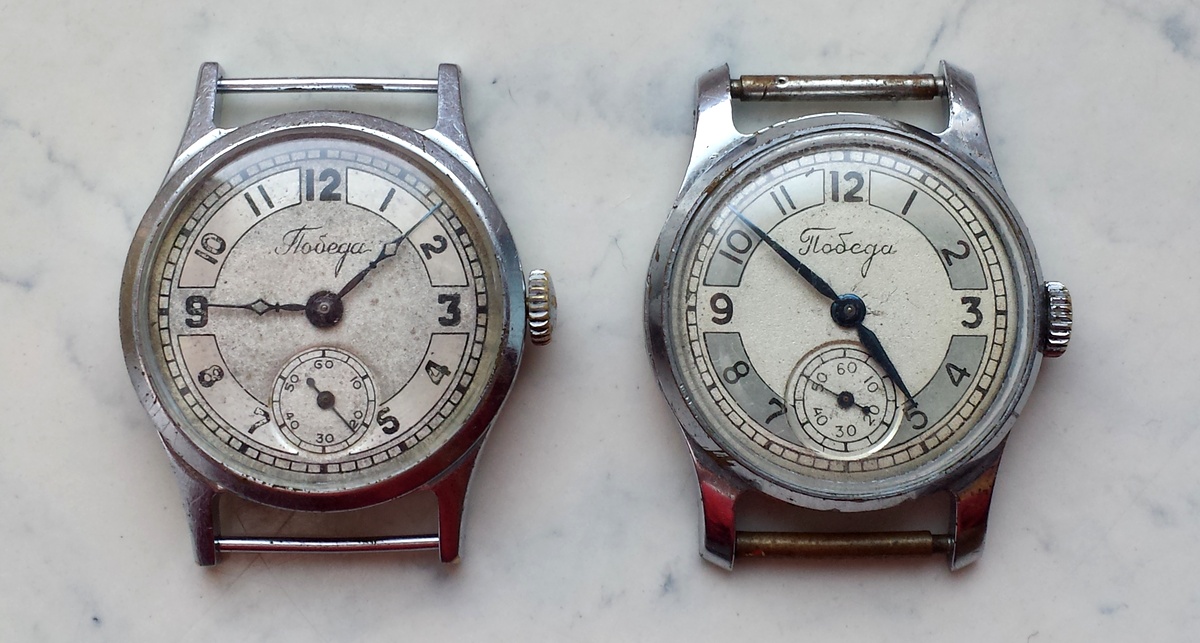 Poniżej zdjęcie. Z lewej strony Pobieda z opisu, z prawej późniejsza Pobieda ZIMowska, rok 1952. Pomijając kopertę, zwraca uwagę inna czcionka indeksów, napisu i sekundnika.