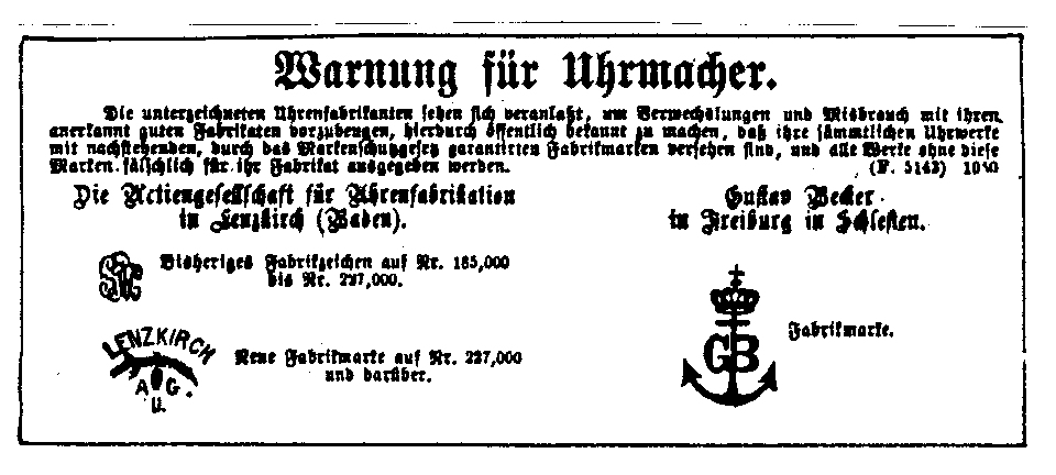 tarant 2971 #996 Napisano 3 Marca 2014 (edytowane) No właśnie, jeszcze errata do inicjalów. Były 2 typy.Aktien Lenzkirch Gesellschaft, czyli ALG taka, jaką zamieściłem powyżej: oraz taka - główna różnica to brak szeryfa w A: Gdzieś po głowie chodzi mi jeszcze trzeci wariant.Niestety. EDITO ten:I jest on taki, jak ten w ogłoszeniu. Obłęd. Żródło:http://www.lenzkirchclocks.com/lenzkirch-trade-symbols.shtml EDIT2H.H. Schmid podaje w 2 wydaniu Lexikon daty wprowadzenia sygnatur tak: ALG , czyli pierwsza w tym poście - "1851" UHRENFABRICKE LENZKIRCH - czyli taka jak ta w kółku zamieszczona na zdjęciu, ale jest FABRICKE "um 1875" GFU - czyli ta trzecia od góry w tym poście "ca 1875 - 1910 (Werknummer 185000 bis 227000)" Alles Klar ? Edytowane 3 Marca 2014 przez tarant 0 Pozdrawiam Piotr Tolerancja musi być nietolerancyjna wobec nietolerancji. Němec z Královce Udostępnij tę odpowiedź Odnośnik do odpowiedzi Udostępnij na innych stronach