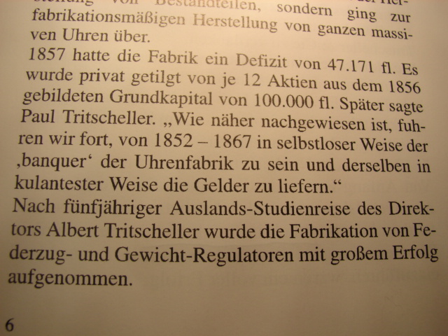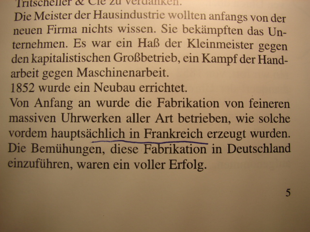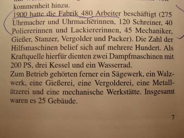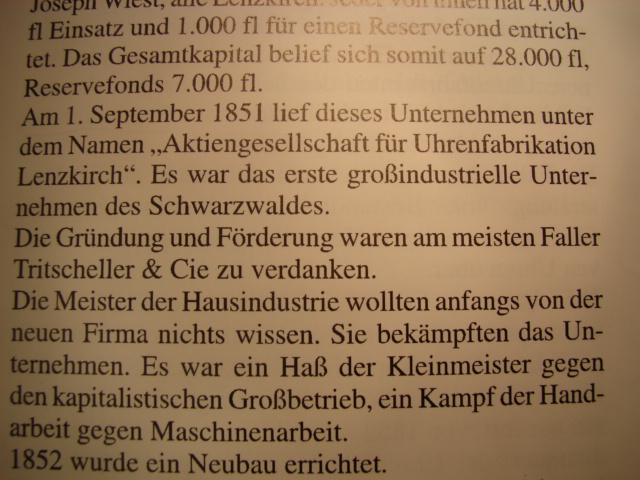 FRANK 1 #1003 Napisano 4 Marca 2014 Wczoraj znalazłem na półce niewielką książeczkę wydaną w 2001 roku napisaną przez Werner Siebler-Ferry prawdopodobnie wnuka dyrektora technicznego fabryki lenzkircha Arno Siebler-Ferry lub Przewodniczącego Rady Lenzkircha Paul Siebler -Ferry pt: "Die Uhrenfabrik in Lenzkirch".W książce opisana jest historia zegarmistrzostwa oraz powstawania fabryki lenzkircha.Autor opisał ilu pracowników zatrudnionych było w poszczególnych latach istnienia fabryki oraz jak wyglądał kapitał zakładowy w poszczególnych latach.Przedstawił składy osobowe Dyrekcji i Rady Nadzorczej w poszczególnych latach oraz ile wypłacano dewidendy .Dane są tak szczegółowe,że prawdopodobnie uzyskał je z dokumentów prywatnych ,które zachowały się w zbiorach rodzinnych. Dla mnie najważniejsze jest to,że opisano jak wyglądały pierwsze lata produkcji ,z których wynika,że tak jak na naszym forum wcześniej pisaliśmy w początkowej fazie produkcji mechanizmy sprowadzano z Francji.Powyższe potwierdza autor tej książki.W załączeniu przedstawiam zdjęcia kilku stron z tej książki z prośbą do Piotra o skrótowe przetłumaczenie . 0 Udostępnij tę odpowiedź Odnośnik do odpowiedzi Udostępnij na innych stronach