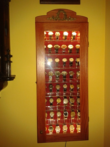 Dębowa gablotka na 48 zegarków z podświetleniem led. Co prawda nie do końca przemyślana i czeka cały czas na swą następczynię wolną od wad, ale zawsze jest i cieszy oko :Dpost-46446-0-61840900-1398102226.jpgpost-46446-0-89637800-1398102315.jpg