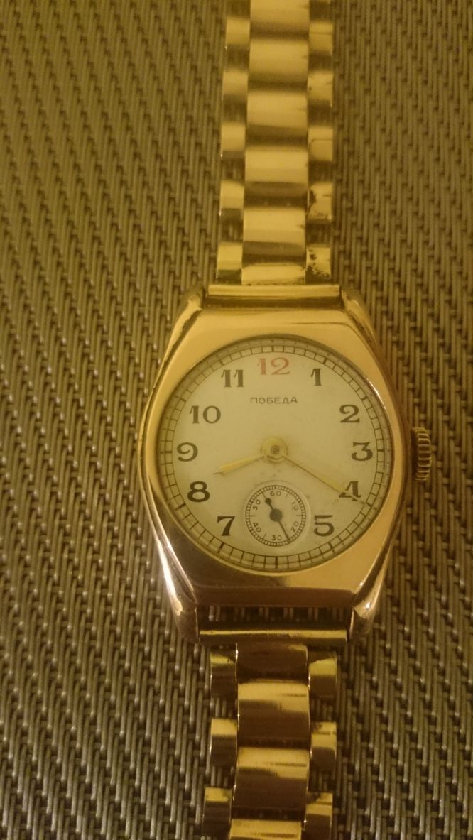 Pobieda: stan 6-7/10, mechanicznie chodzi, dokładności nie badałem, ale na ręku wskazywała dobrze czas, pasek bez szlufki (może jakąś bym znalazł), raczej do zmiany lub poprawek, należy traktować jako gratis.