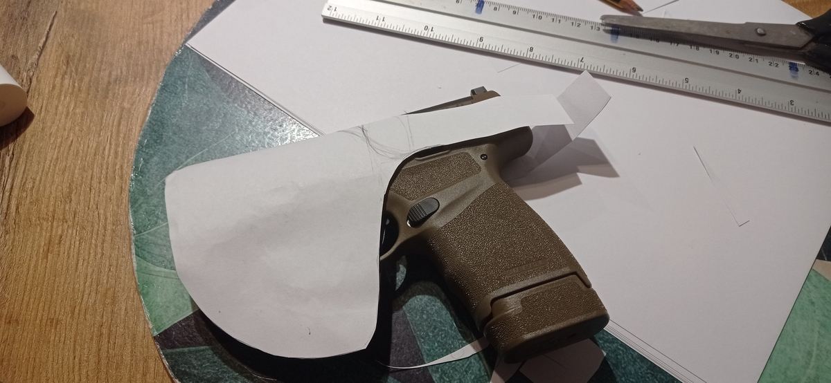 Pierwsze przymiarki, ale chyba jednak pójdę w wersję bez zapięcia, bo jednak pistolet jest dosyć drobny a zapięcie pogrubi jego bok x2. Kabura wewnętrzna, może coś jak na zrzutach z filmu na YouTube.