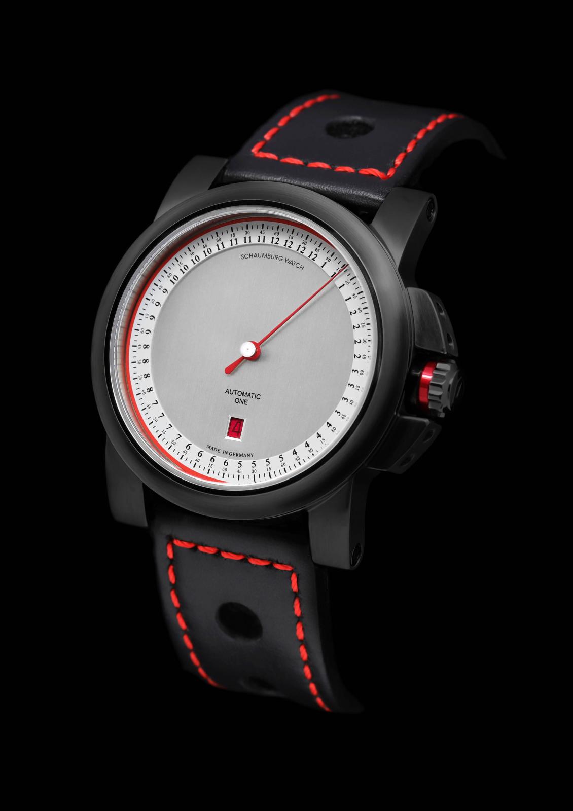 Schaumburg GT-Motorsport ONE Automatic SCH-GT1R to świetna propozycja dla fanów wyścigów rajdowych i jednowskazówkowych zegarków. Swoją stylistyką model nawiązuje właśnie do motoryzacji. Jego czarny, skórzany pasek z okrągłymi wycięciami zdobią czerwone przeszycia. Srebrną kopertę o okrągłym kształcie wykonano ze szczotkowanej stali szlachetnej. Osadzono w niej szarą, szczotkowaną, przykrytą szkłem szafirowym tarczę, która pokazuje czas za pomocą jednej wskazówki. Na wysokości godziny szóstej ulokowano datownik dni miesiąca. Pracę mechanizmu automatycznego, który odpowiada za dokładny chód zegarka, możemy oglądać przez zakręcany, transparentny dekiel.
