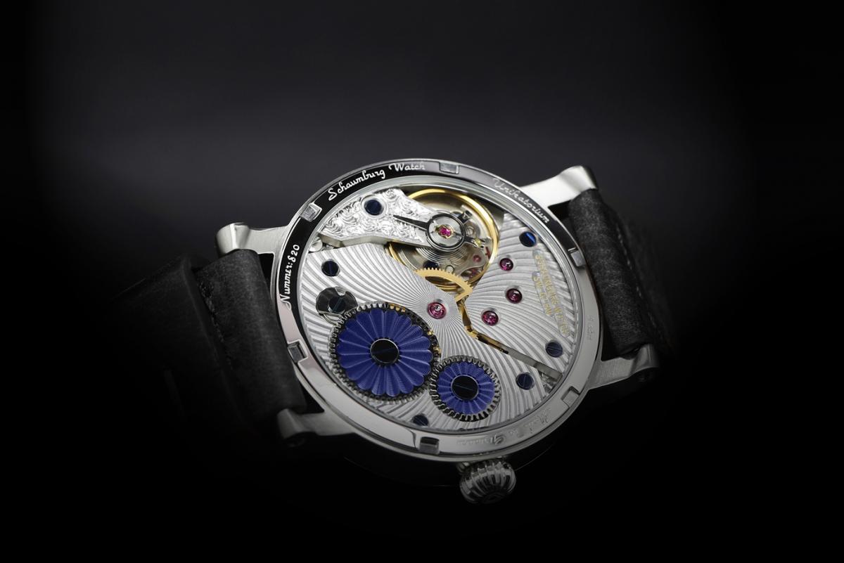Patynowana stal, tarcza ręcznie grawerowana, mechanizm SW-07 (unitas) ręcznie grawerowany i szkieletowany, 5 ATM, 42 mm.