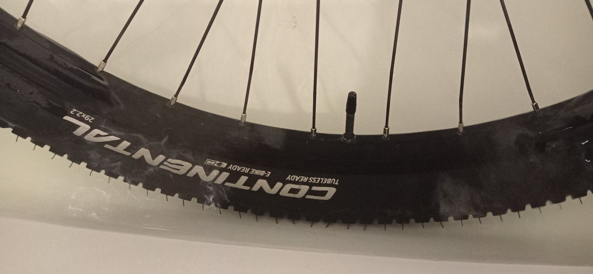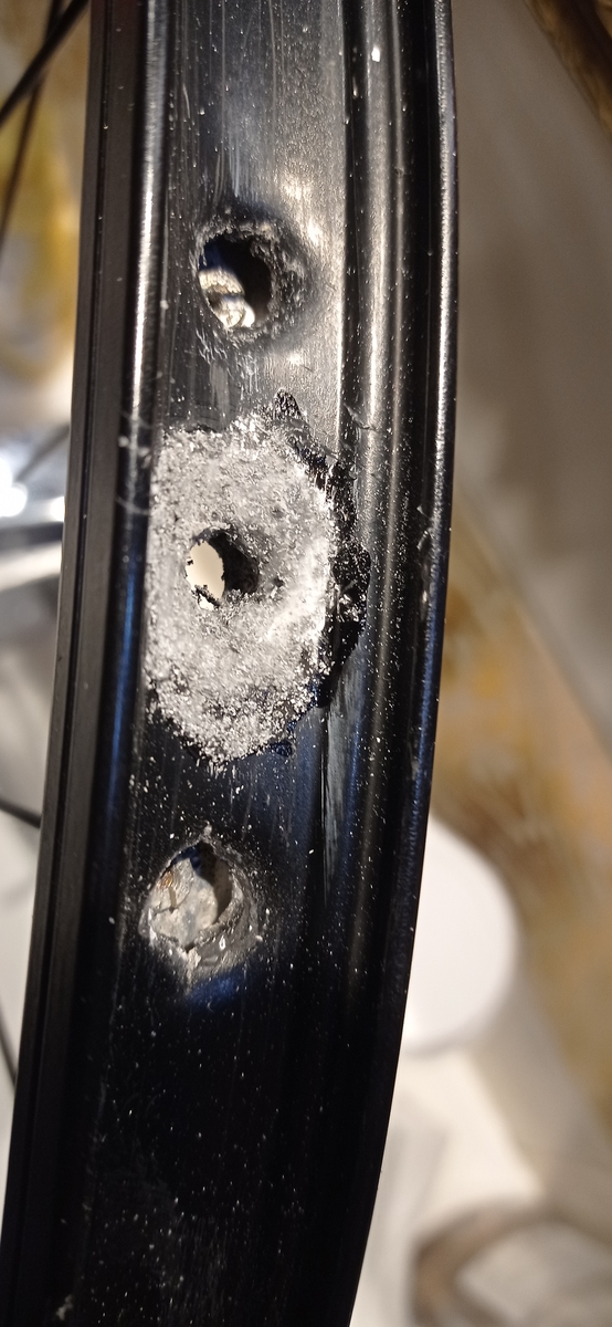 Ach, w ferworze walki nie zrobiłem zdjęcia po oszlifowaniu. Po tym zabiegu wygląda jak szlifowany spaw. Otwór na wentyl poprawiłem szlifierką z kamieniem o odpowiednim kształcie, tak by stożkowa gumowa cześć zaworu pasowała idealnie.  Przed chwilą sprawdziłem szczelność w wannie, był lekki wyciek, ale pomogło minimalne dociągnięcie wentyla (przy dokręcaniu zaworka ujawniłem, że mimo silnego dowalenia to się jednak cała oprawa zaworu obracała). Ujawniłem też minimalny wyciek powietrza w miejscu dawnego uszkodzenia opony. Po jednej 1mm bańce na sekundę, ale pomachałem kołem i przestało. Naklejka osłania miejsce łączenia obręczy, tego się najbardziej obawiałem ale ostatecznie jest ok. Ostatnie foto to dawne uszkodzenie... wstyd przyznać, ale o drzwi klatki schodowej a nie kamienie.