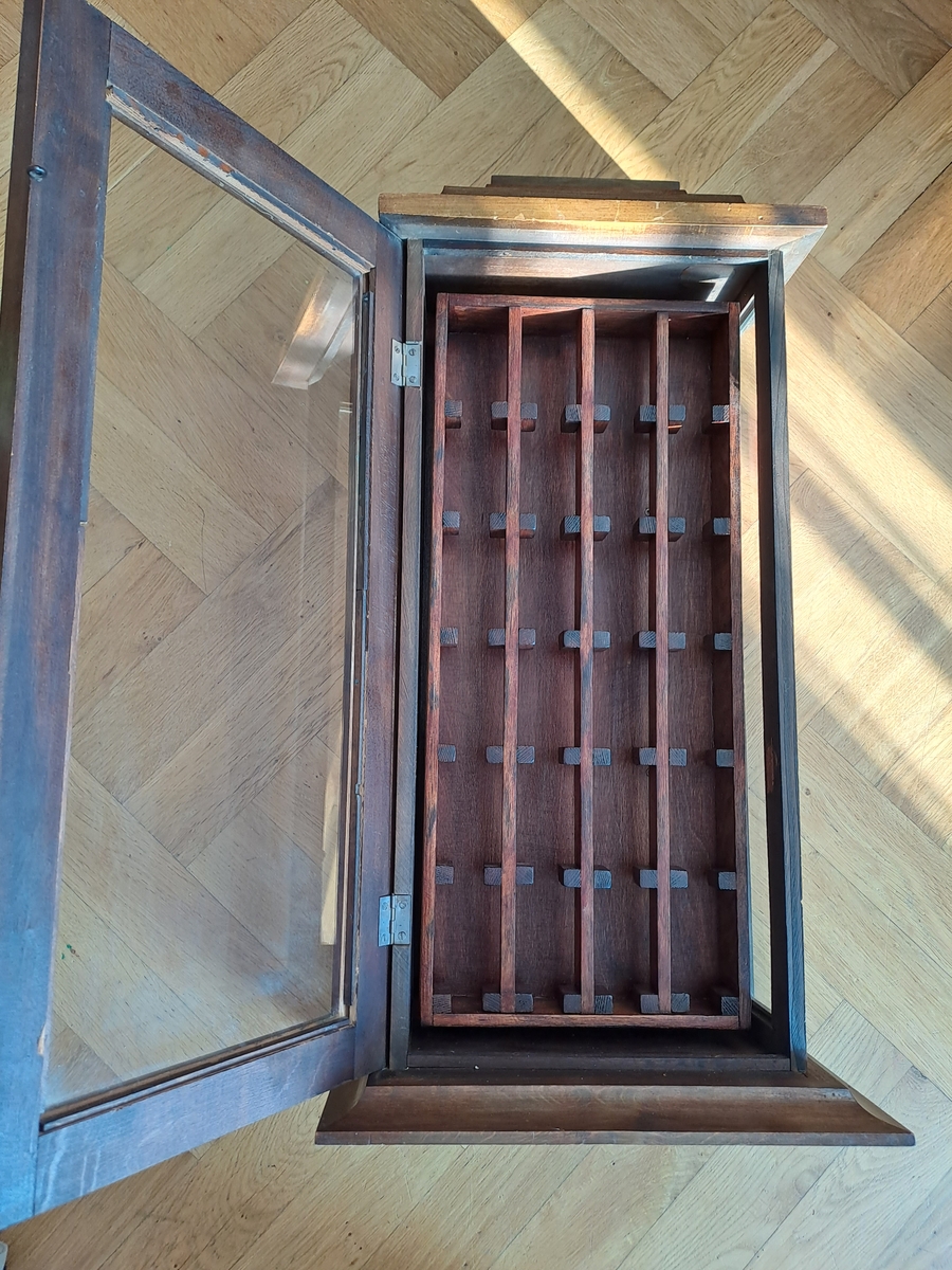 Po kilku błędach i eksperymentach skończyłem. Nie lada wyzwanie było z zawiasami. Z racji że szkło nie chciałem już wiercić. Zastosowałem szkatułkowe z blokadą kąta wklejona na klej UV. Otwory zamaskowałem łepkami  wkrętów .
