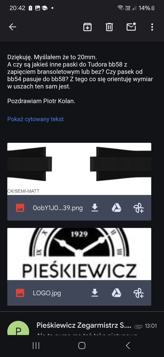 Panowie. Chciałbym kupić gumę do mojego bb58. Chodzi mi o ten pasek gumowy z zapięciem bransoletowym jak w nowym bb58 gmt lub jak w bb54. Napisałem do Pieskiewicza że chciałbym tą gumę od tego nowego Tudora zamówić. Podesłał mi foto gumy 21mm. Napisał że jest inny wymiar. Wydaje mi się, że i ten mój i 58gmt mają takie same wymiary między uszami. Napisałem kolejnego maila czy guma od bb54 by pasowała do bb58. Napisał że ta guma ma inny system mocowania i że nigdzie nie ma info czy ta guma bd pasować. Sam już niewiem czy dać za wygraną i odpuścić czy drążyć temat. Inne paski gumowe raczej mnie nie interesują. Chodzi mi właśnie o ten efekt gdzie pasek montowany jest do tych ogniw przy kopercie oraz zapięcie btansolerowe z t-fit. Orientujecie się może czy ta guma od bb 58gmt lub 54 może pasować do zwykłej 58?