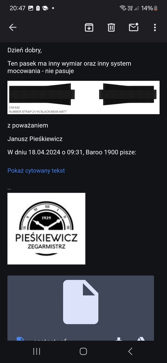 Dzięki za info. Chyba najprościej będzie kupić gumę Rubber B. Patrzyłem na YT to wygląda bardzo solidnie. Nawet chyba lepiej niż oryginalna, choć oczywiście nie ma zapięcia, i jest inne mocowanie. Ta gumę widziałem z oryginalna klamra, ale z tym zapięciem które występuje przy dedykowanych paskach skórzanych. Narazie najlepszym rozwiązaniem byłaby sama guma, jeśli polubię to mógłbym wtedy te zapięcie dokupić. Czy polubię nwm. Nigdy na pasku gumowym nic nie nosiłem.