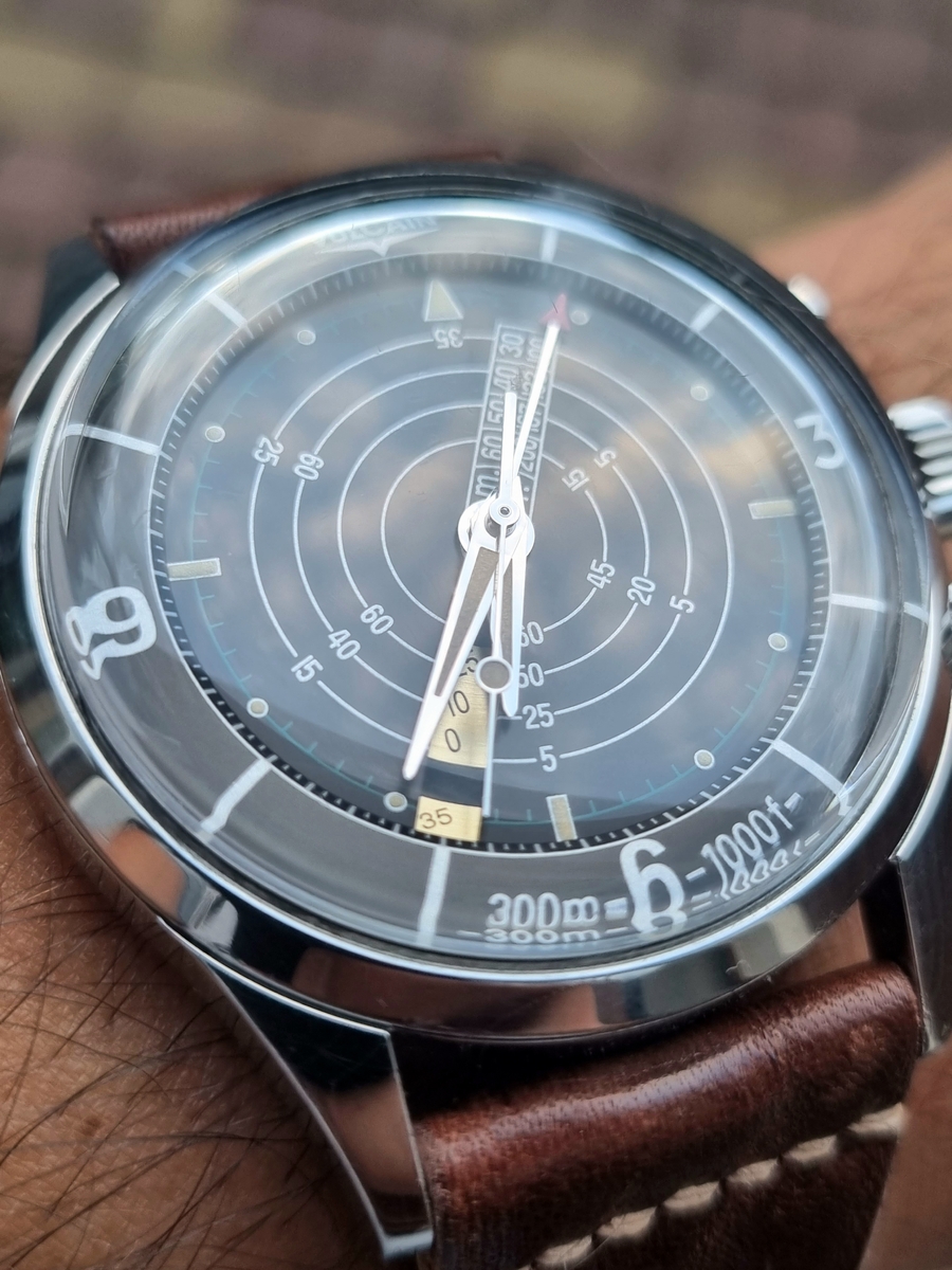 - Grubością. Vulcain z racji machanizmu połączonego z alarmem ma ok. 15-16mm (różne żródła). Longines tylko 13mm. Wiąże się to jednak nie tylko z konstrukcją mechanizmu ale też szkiełkiem o czym poniżej.