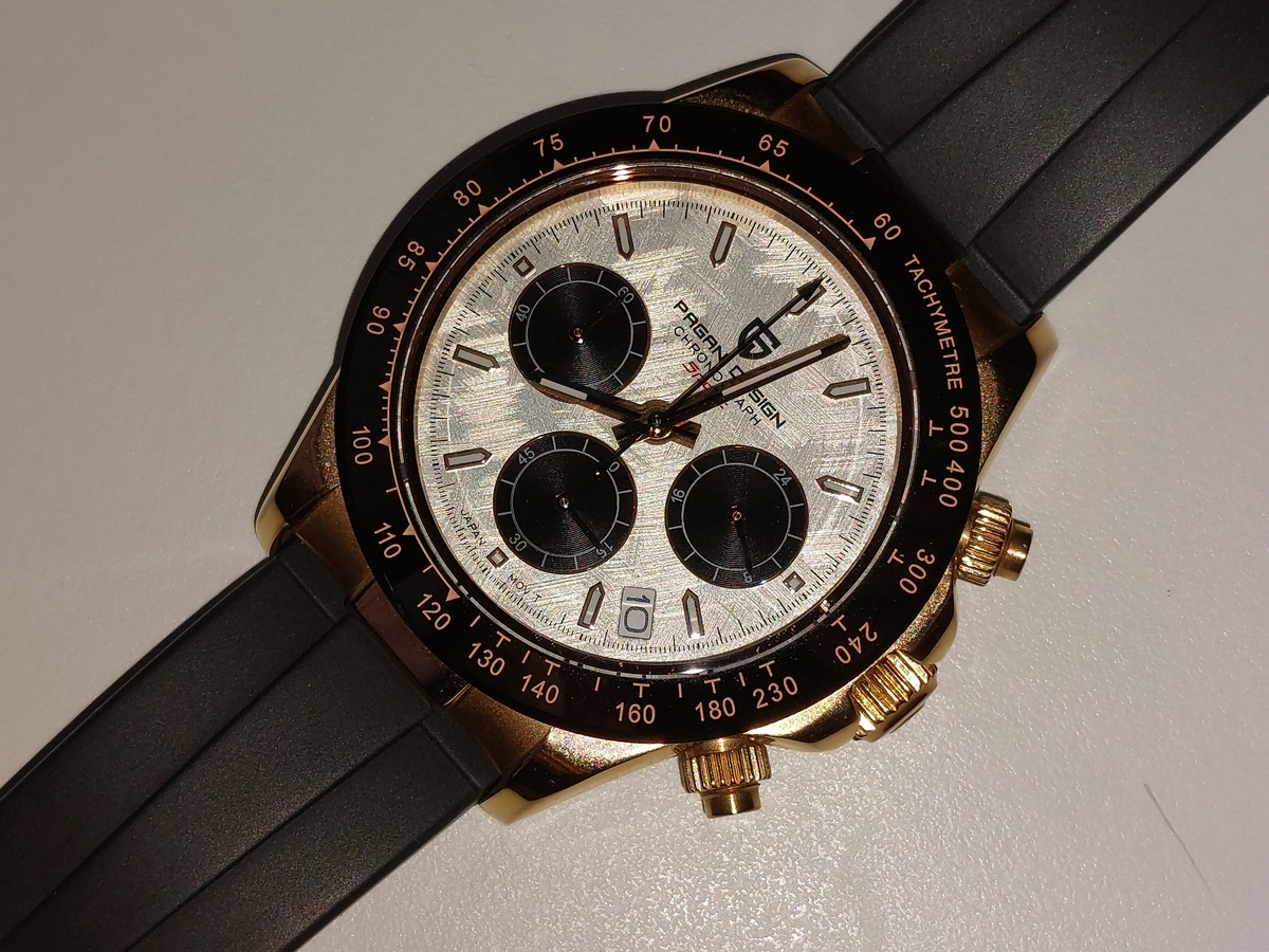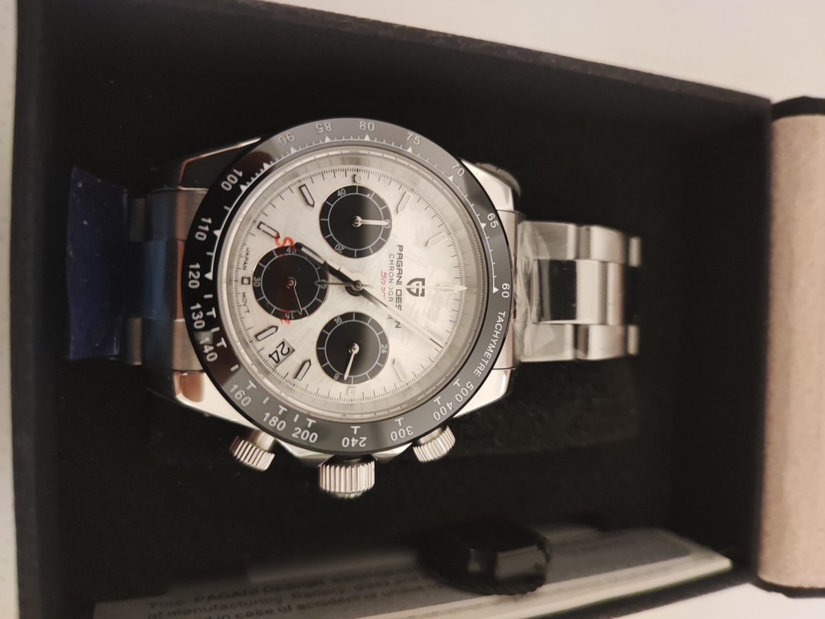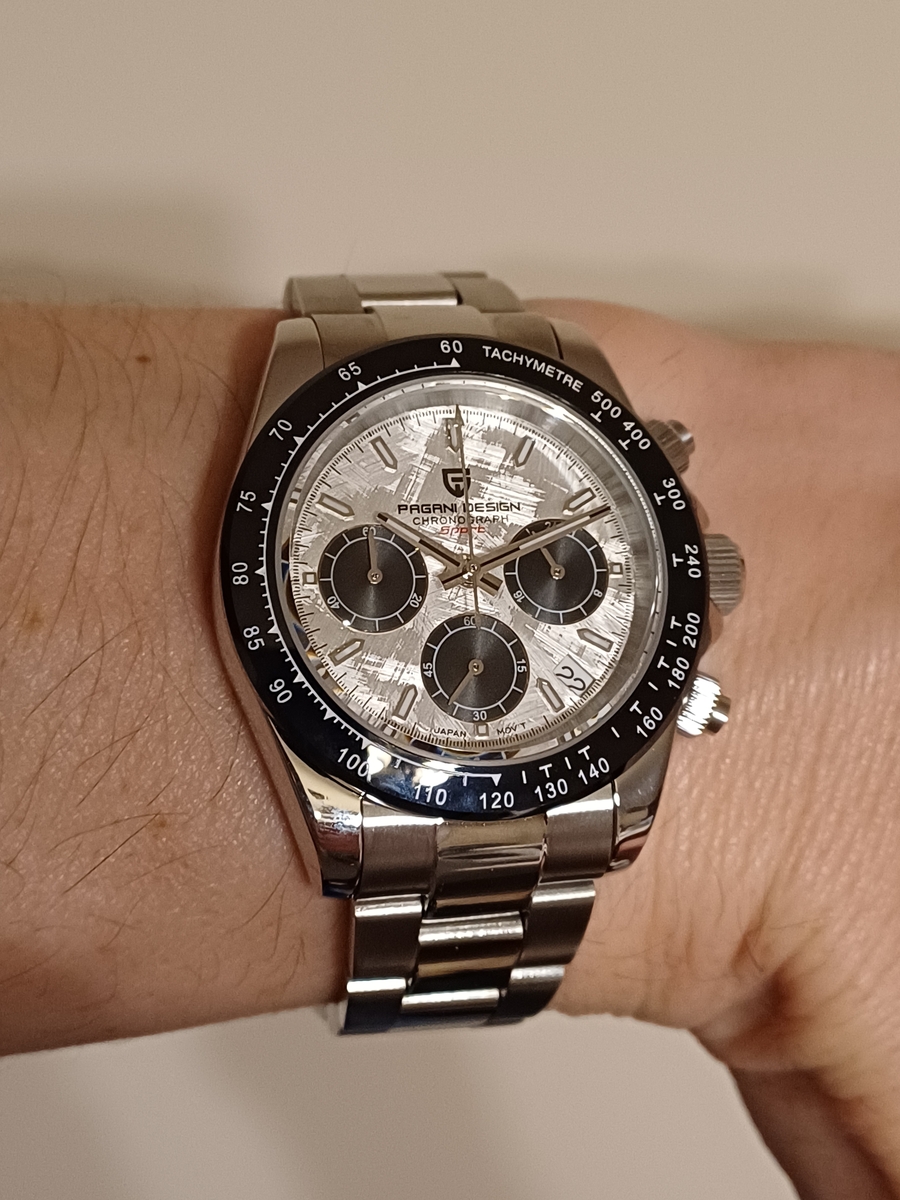 Doszedł mi pierwszy chrono by Poganin. Tarcza meteorytowa fajna ale kurde chronograf chyba nie dla mnie - po co mi fajna sekundowa wskazówka jak robi tylko za stoper(dopiero teraz doczytałem jak to działa).  Druga sprawa to bardzo ciężko chodzi zapięcia bransolety. Niby ładna ale czy w seiko czy steeldive jest ok a tu walka na siłę.Na szczęście czekan na pasek. Na plus wielkość i kształt koperty. Zaczynam rozumieć fenomen Rolka daytony.