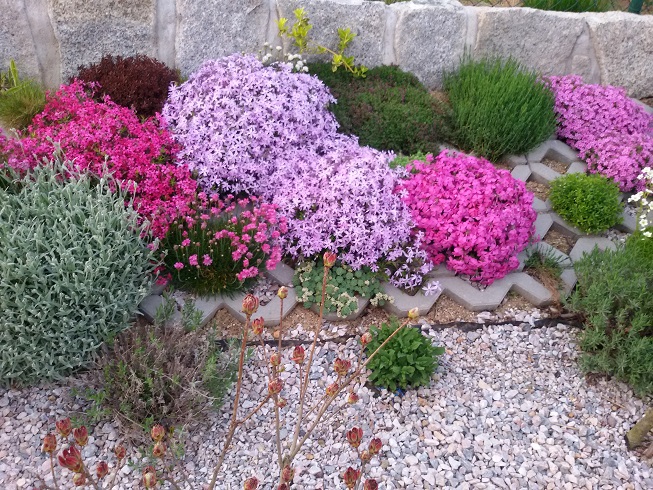Po konsultacji z moim ogrodnikiem ;) , wszystkie te rośliny to tzw. skalniaki. Różowe to floksy, zawciąg nadmorski, goździki. Fajne pokrycie terenu, bardzo szybki rozrost oraz bardzo odporne na słońce i brak wody.