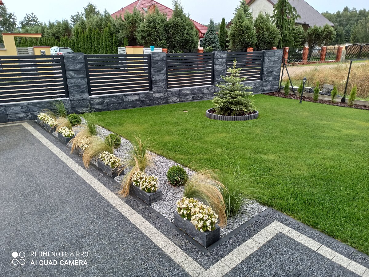 Bardzo ładny, duży, lśniący nowością trawnik i ogród. Proponuję tę piękną, nową kostkę szybko zaimpregnować, tylko takim impregnatem bez efektu "mokrej kostki". I tak potem co kilka lat - Karcher i impregnacja. Taras w szczególności (zależy z czego zrobiony) - bo pewnie takowy też gdzieś tam jest. Warto, szczególnie jeżeli jakiś sąsiad w okolicy pali w zimie węglem.