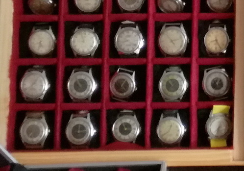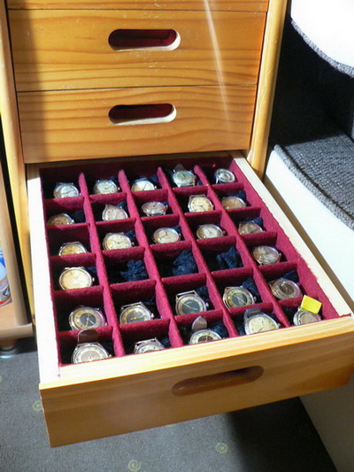 Sposób Jurka na składowanie zegarków ma plusy i minusy .  Plus to oszczędność miejsca i brak kosztów za paski. Minusy to że Ich nie widać , trzeba otwierać szuflady , tak jak u Mnie pudełka no i jak powiedzmy gość chciałby bliżej się przyjrzeć modelowi to trzeba wsadzić łapsko i wydłubać z przegródki.