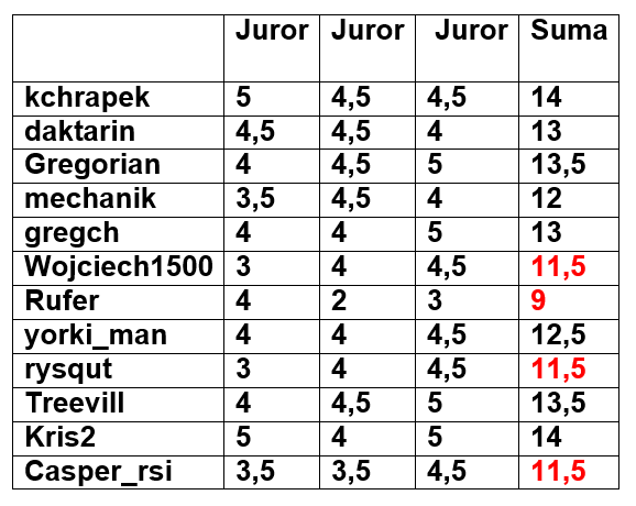 Gratuluje Tym którzy awansowali do następnej rundy, dziękuję tym którzy poświęcili swój czas i mam nadzieję że nadal się będą z nami bawić :)