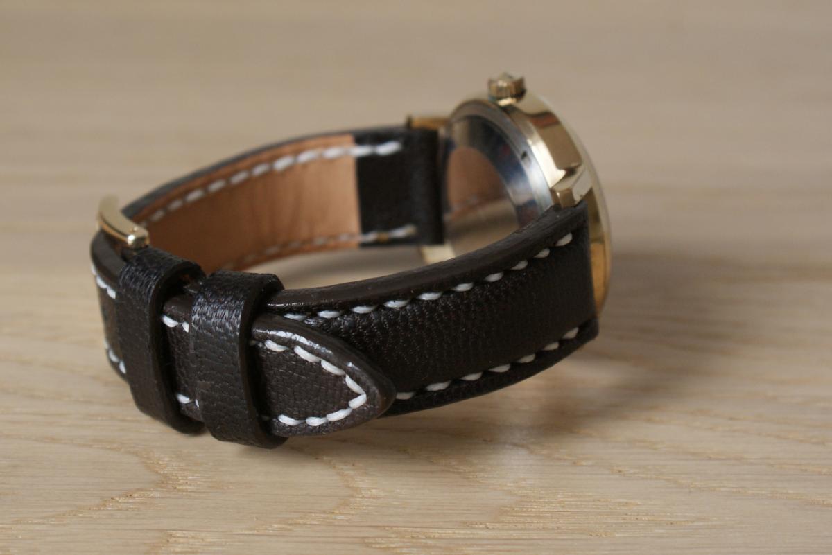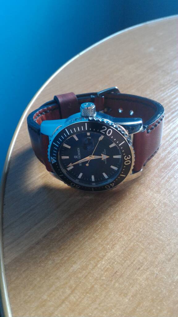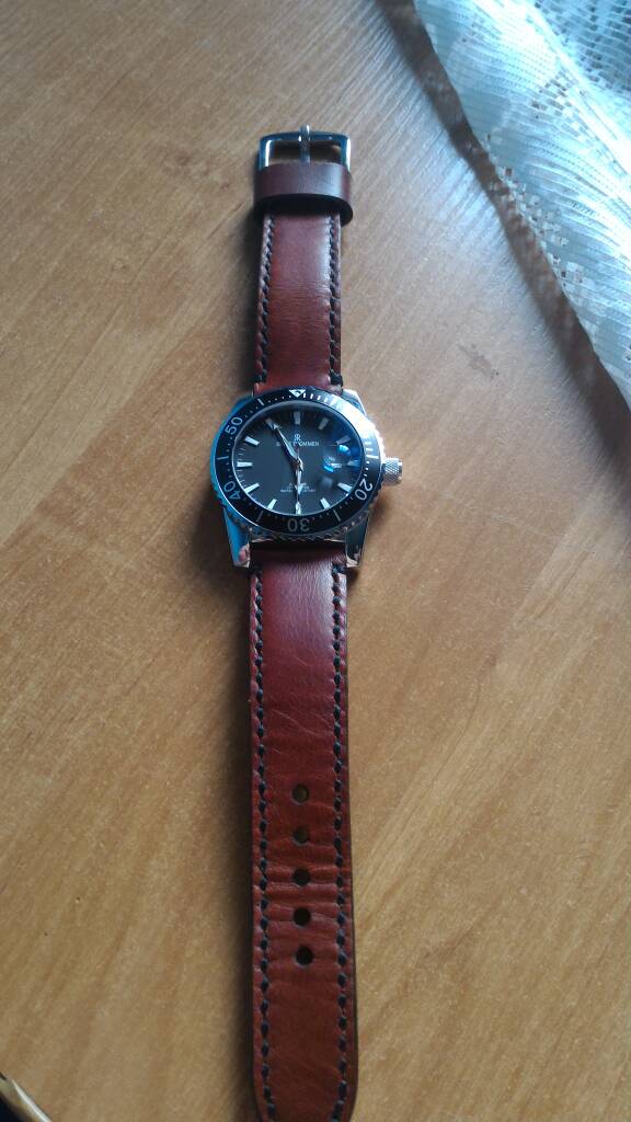 Zainspirowany skarbnicą internetu postanowiłem stworzyć paseczek do kolejnej Amfibji. Włoska skóra w ciekawym "zardzewiałym" licu. Pasek ma 18 mm w uszach i jest zwężany do 16 mm. Brzegi ręcznie malowane specjalną, elastyczną farbą do krawędzi.