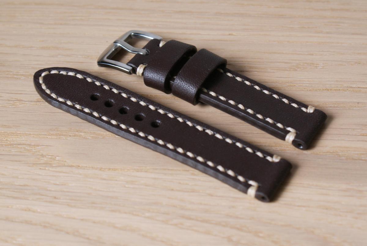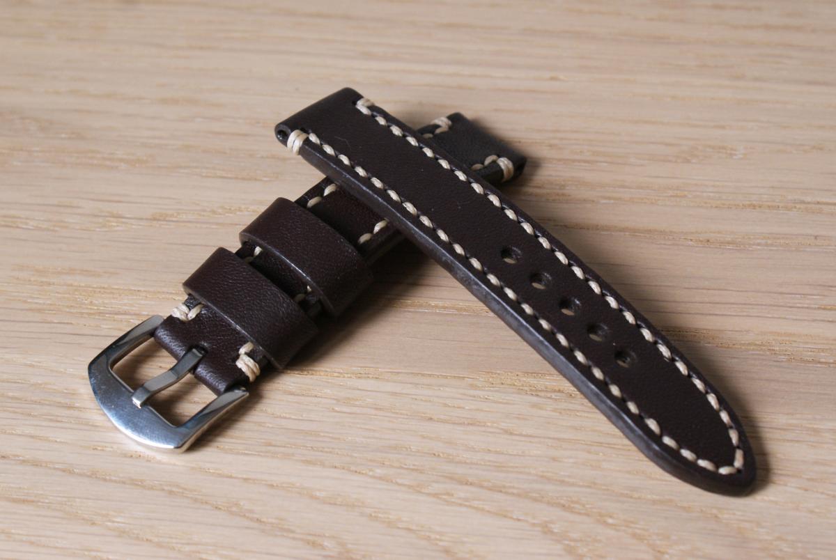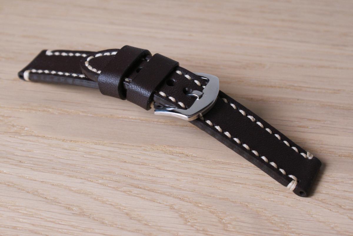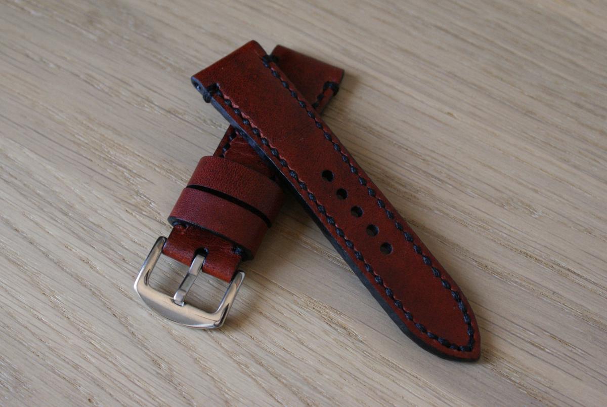 Powstał także jeden na zamówienie, ma całkiem spore gabaryty: 24 mm zwężane do 22 mm. Długość 140/85 mm :)  Delikatne wypełnienie między uszami z juchtu, ręcznie profilowane żeby gładko przechodziło do cieńszej części. Brzegi malowane elastyczną farbą, oraz szycie po całości. Stalowa klamerka w zestawie :)