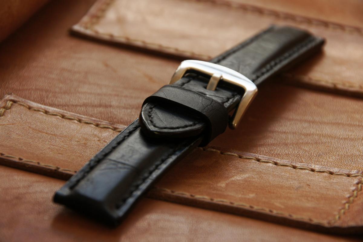 Skóra bydlęca, tłoczona i ręcznie farbowana na czarno. 20 mm szerokości. Wypełnienie z ręcznie profilowanego juchtu. Od spodu także jucht naturalny, garbowany roślinnie. Wszystko zabezpieczone specjalistyczną mieszanką olejów i wosków :)