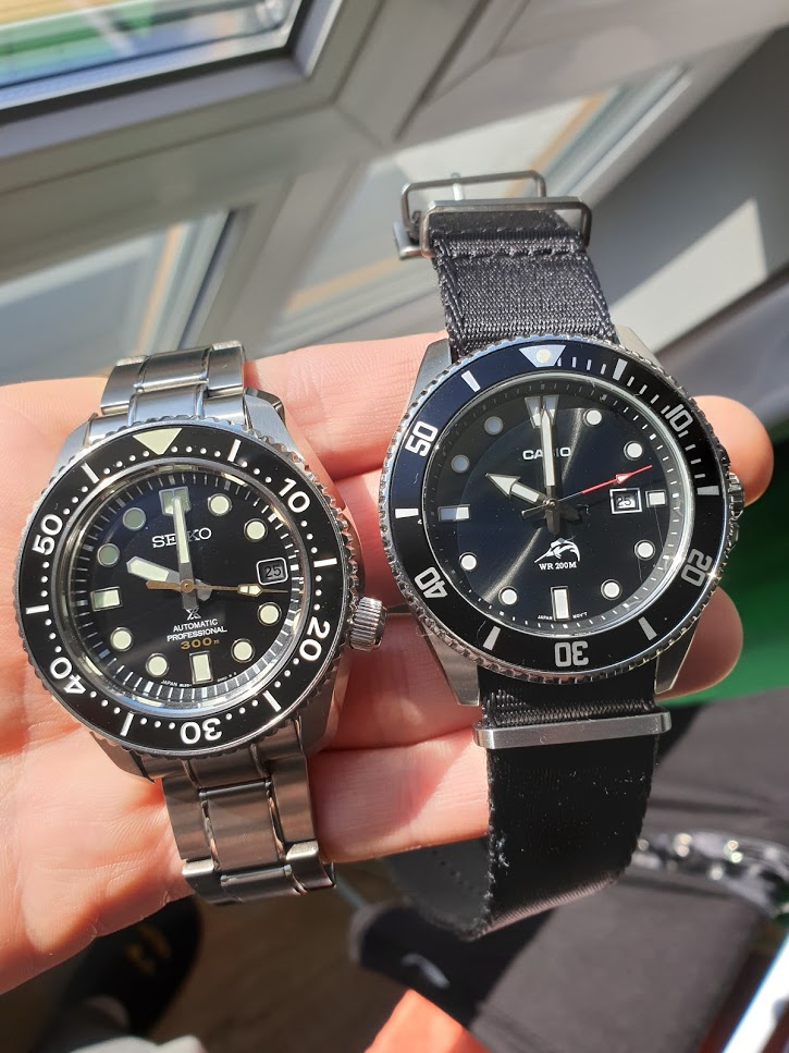 Witam. Zegarek w świetnym stanie, noszony na zmianę z innym. Świetnie spisuje się w koło chałupy, na ryby, do lasu, zrobił kilkanaście tysięcy km na ciągniku siodłowym, towarzyszył na załadunkach i rozładunkach, słowem - nie boi się wyzwań, do tego był zakupiony i bardzo dobrze spełnia swoje zadanie. Pancerny nie jest, aczkolwiek jak na tę kilka przygód które przeżył, wygląda doskonale. Jedna ryska znajduje się na bezelu (nieobrotowym) na godzinie kwadrans po siódmej i jest widoczna pod pewnym kątem, starałem się ująć ową skazę na fotce, rysa znajduje się na prawo od czerwonej kreski. Na szkiełku dwie drobne ryski, na godzinie 11 oraz wpół do 12, nie ma jak ich ująć aparatem, są bardzo znikome i widoczne pod mocne światło z lampki, koperta również w dobrym stanie, polerowana, bez zadrapań i rys. Dekiel bez skaz. Wygodny gumowy pasek, przyjemnie pachnący, kiedyś oberwał psiknięciem perfum i od tamtej pory, nieprzerwanie, delikatnie nimi pachnie. W skali forumowej, dla bezpieczeństwa dam 7/10.