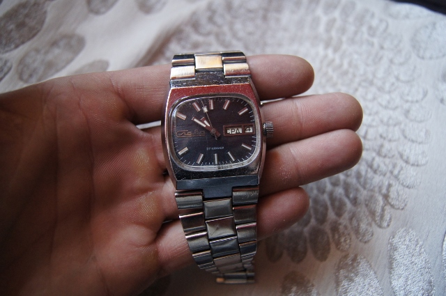 Kolejny sikor szuka nowego właściciela...Złocona Pobieda z rzadziej spotykaną tarczą w pasy, stan bardzo, bardzo dobry ;). Po pełnym przeglądzie w październiku tego roku. Założony nowy pasek. Tarcza i wskazówki można powiedzieć ideał, koperta lustro z mikroryskami widocznymi z bliska, żadnych przetarć, może delikatne przy mocowaniu teleskopów ;). Szkiełko ma malutkie delikatne pęknięcie (niewyczuwalne pod paznokciem) na godzinie 6, ale mi to nie przeszkadzało bo jest w świetnym stanie. Koronka stan dobry+. Średnica 34 mm bez koronki. Cena: sprzedane z przesyłką po mojej stronie :). Nie, nie jest to Timex :P.