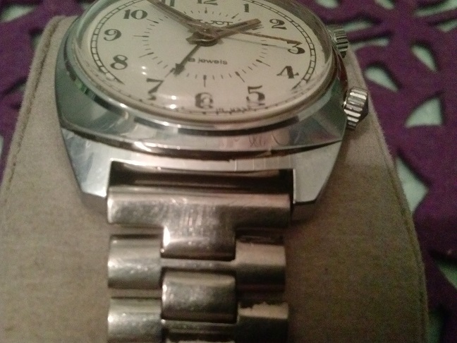 Poljot z czarną tarczą, na chodzie ale się śpieszy. Koperta i szkiełko stan dobry, małe ubytki farby na sekundniku.
