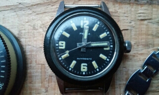 2. Wostok, a w zasadzie bardziej Ałmaz z tarczą Wostoka. Werk Czystopolski 18 kamieni, na chodzie ( i to nawet dokładnym), lecz przy nakręcaniu coś przeskakuje, tarcza od precyzyjnego, koperta w bardzo fajnym stanie, bez przetarć i ubytków, koronka równiez fajnie zachowana :) Zegarek bez szkła. Myślę, że po założeniu tarczy od Ałmaza, będzie fajna sztuka :)