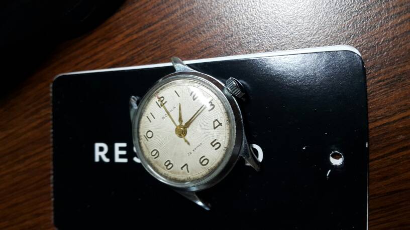 2. Slava Chorągiewka na części, środek nie do uratowania, za to koperta jest w stanie wręcz idealnym, powiem szczerze miałem 3 chorągiewki, ale zewnętrznie żadna nie była w takim stanie, tarcza również bardzo dobra, te rysy to na szkle. W środku mechanizm który nie działa, bez modułu automatu i data nie działa.