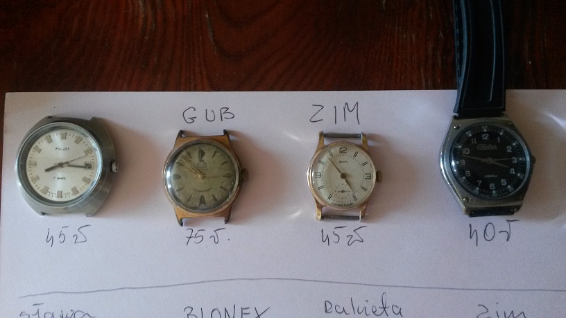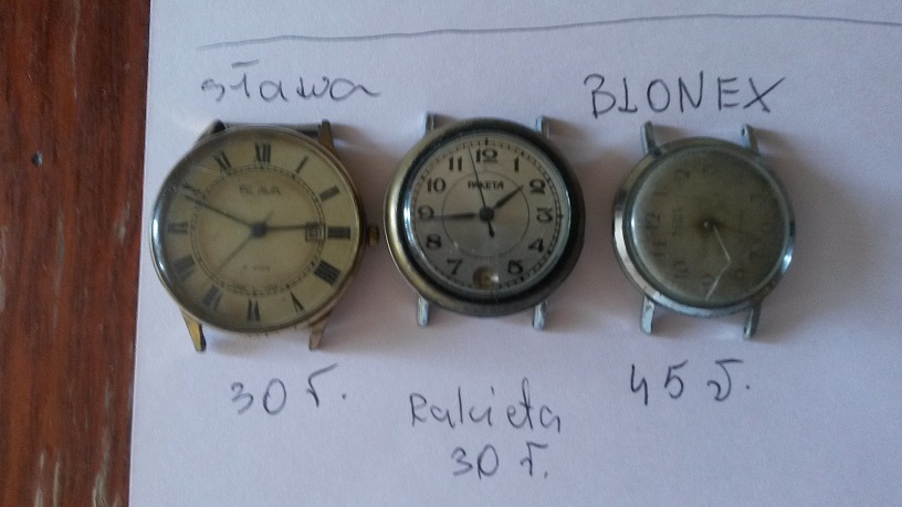 Moskwy, jedna kompletna i na chodzie (żółte bikiniarskie szkiełko)- słaba tarcza, druga bez sekundy, zbite szkiełko i złamana oś balansu ale lepsza tarcza. 30 zł za obie.