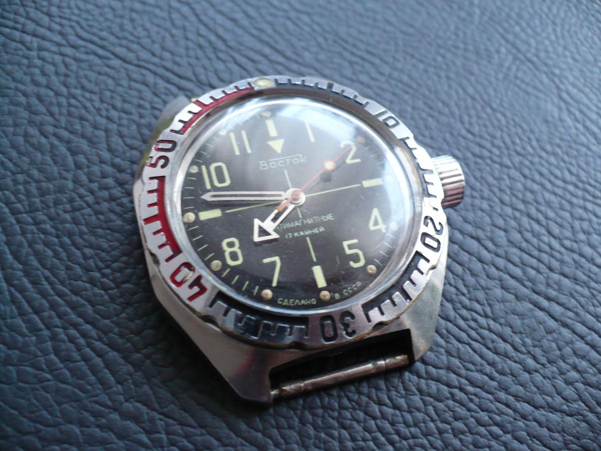 Komandirski w automacie. Koperta i bezel w ładnym stanie. Automat. Pękniete szkiełko w ok. 11-12 godz. Cena: 110.
