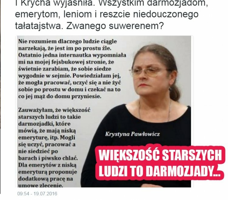 Ta grafika ze słowami Pawłowicz podobno jest nieprawdą. Sam dziennikarz Konrad Piasecki usunął ją ze swojego profilu i przeprosił posłankę. To nie zmienia jednak faktu, że baba jest z kosmosu i tylko szkodzi wizerunkowo partii rządzącej.