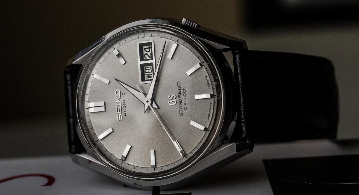 A tymczasem praszczur - pierwsze automatyczne Grand Seiko, 62GS, niedawno wypuszczone jako wznowienia z mechanizmami hi-beat i SD, tu 50-letni oryginał. Koronka bocznie żeby podkreślić że nie trzeba ręcznie nakręcać - zresztą nie da się. Szkiełko bez bezela, doskonała widoczność tarczy.