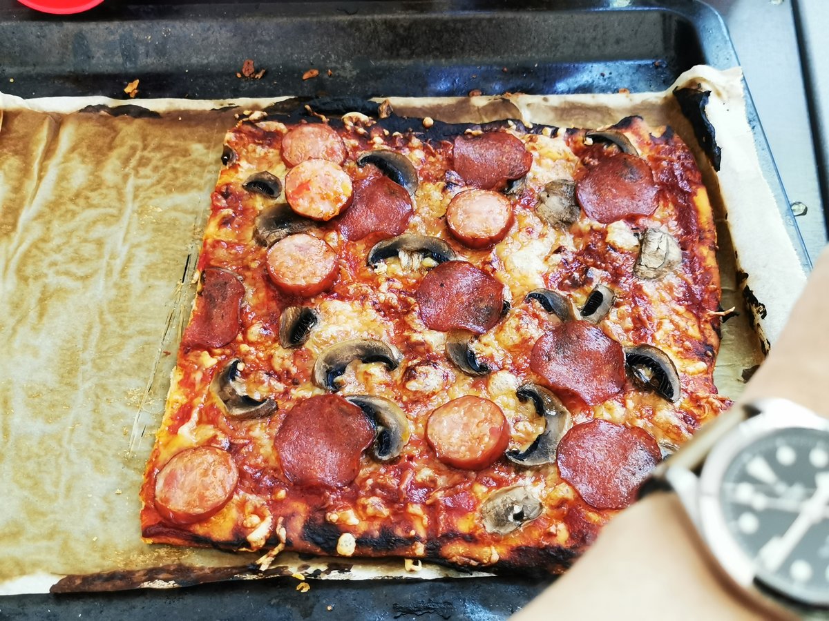 Pierwsza samodzielnie przygotowana pizza (ciasto z Lidla). Troszkę za długo w piecyku, ale nie od razu Kraków zbudowano ????