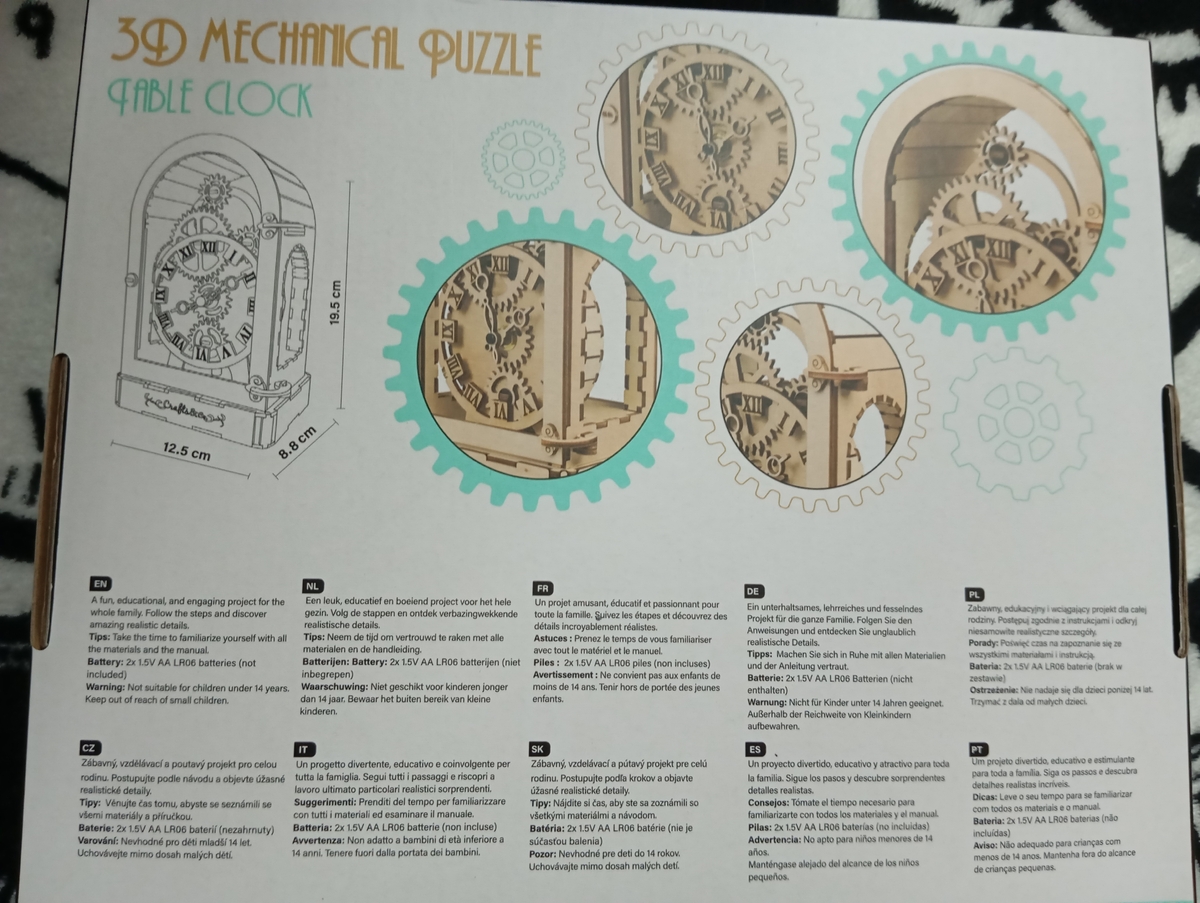 2. Zegar kominkowy o wymiarach 19,5x12,5x8,8 cm. Zawiera 125 elementów. Stopień trudności: 3/5. Wymaga 2xAA.