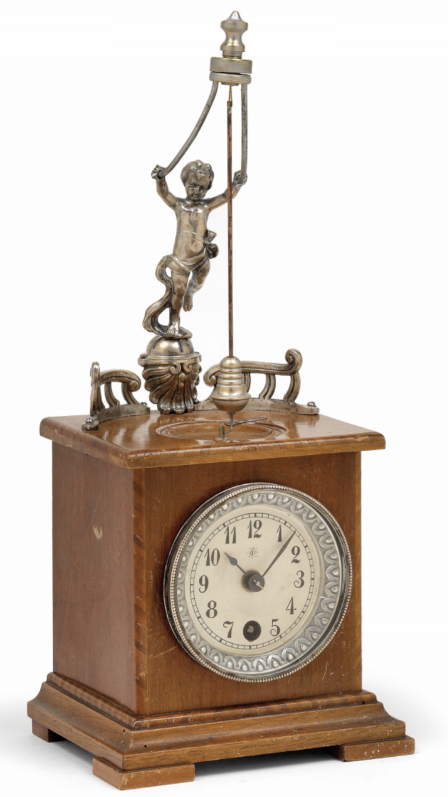 Gustav Becker Mystery Clock, Germany, mahogany case with four turned columns supporting the flat top suspending a gridiron pendulum with the clock drum as the bob, enameled arabic numeral dial with the company trademark, rear-wind time-only movement, ht. 12 in.