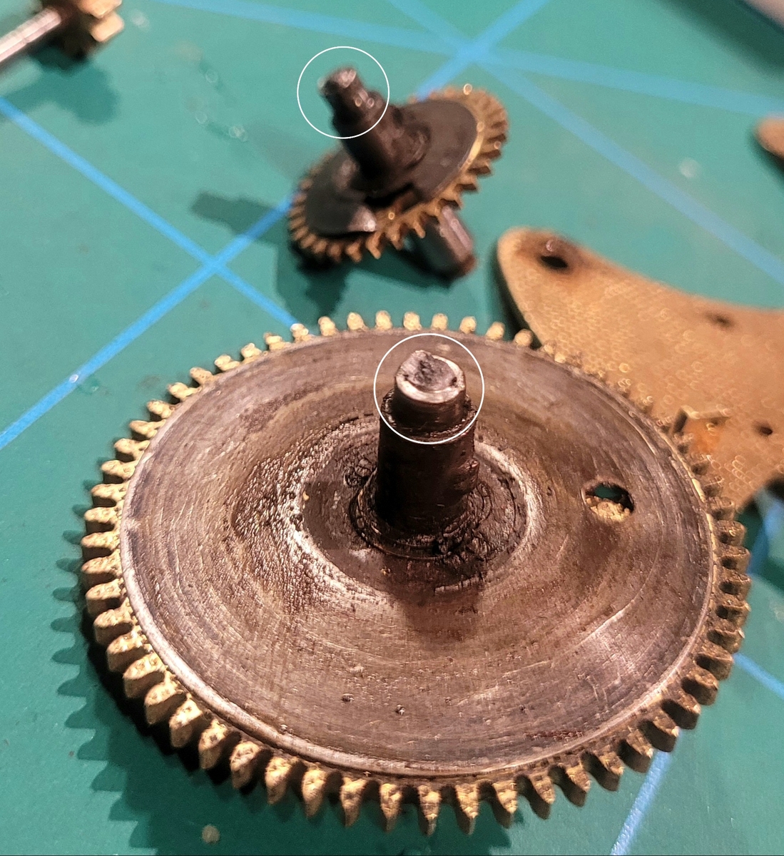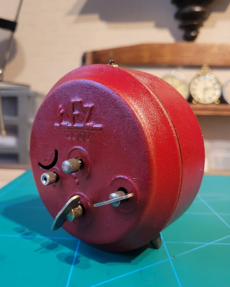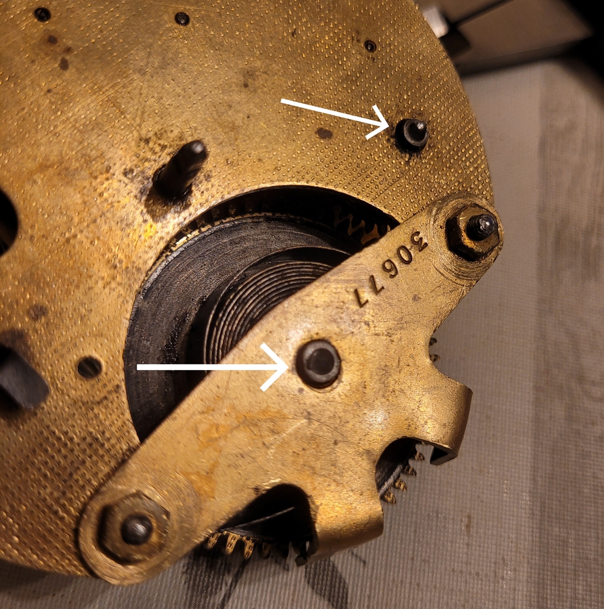 Patrząc na stan, to mój mechanizm nie wykazuje śladów użytkowania. Jest tylko zakurzony ale śruby nie są naruszone a i śruby pokręteł są w bardzo dobrym stanie. Ramię młotka nie nosi śladów demontażu młoteczka. Mechanizm kupiłem na likwidacji zakładu zegarmistrzowskiego w Legnicy. Niestety obudowy nie było.