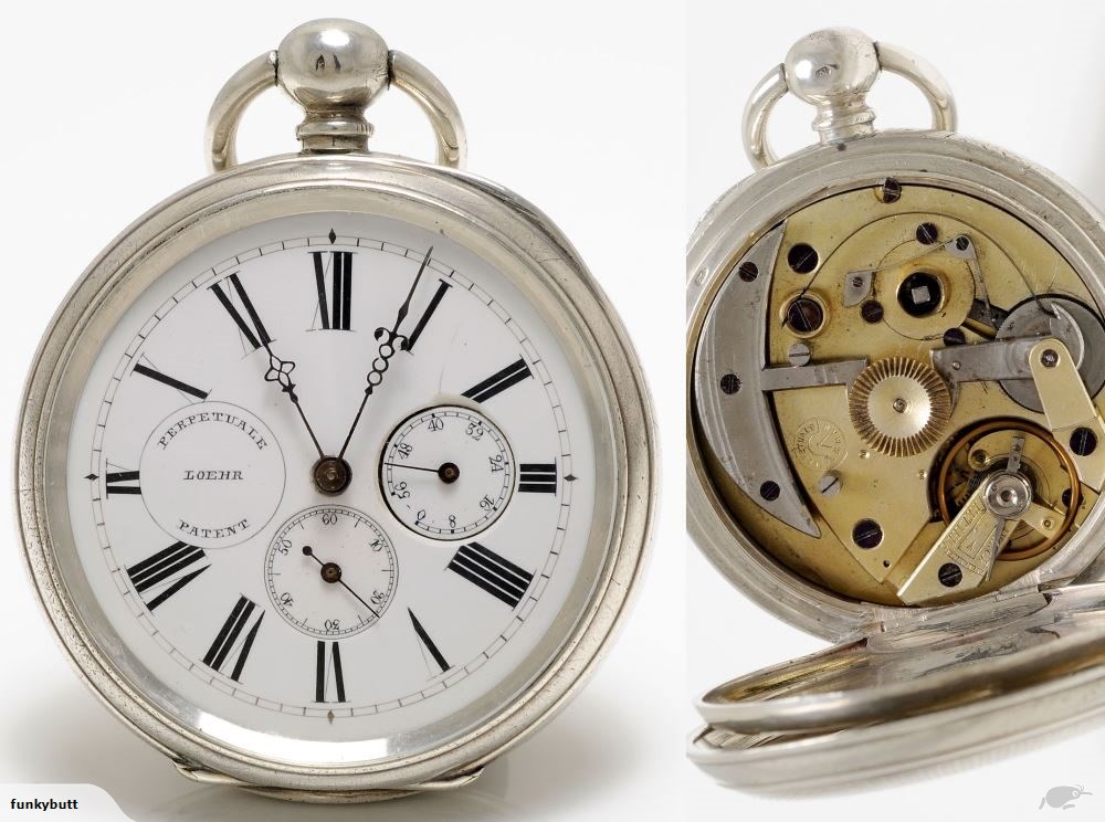 Pierwszy opatentowany zegarek automatyczny, August von Loehr, Wiedeń, 1880. Podkreślam opatentowany. Modele z rotorem, "bumper" i z ruchomym całym środkiem werku pojawiły się pod koniec XVIII wieku. Warto zauważyć także wskaźnik naciągu. Patent wygasł, ale kto wie, spadkobiercy mogliby pogonić i Harwooda i Rolexa ;)