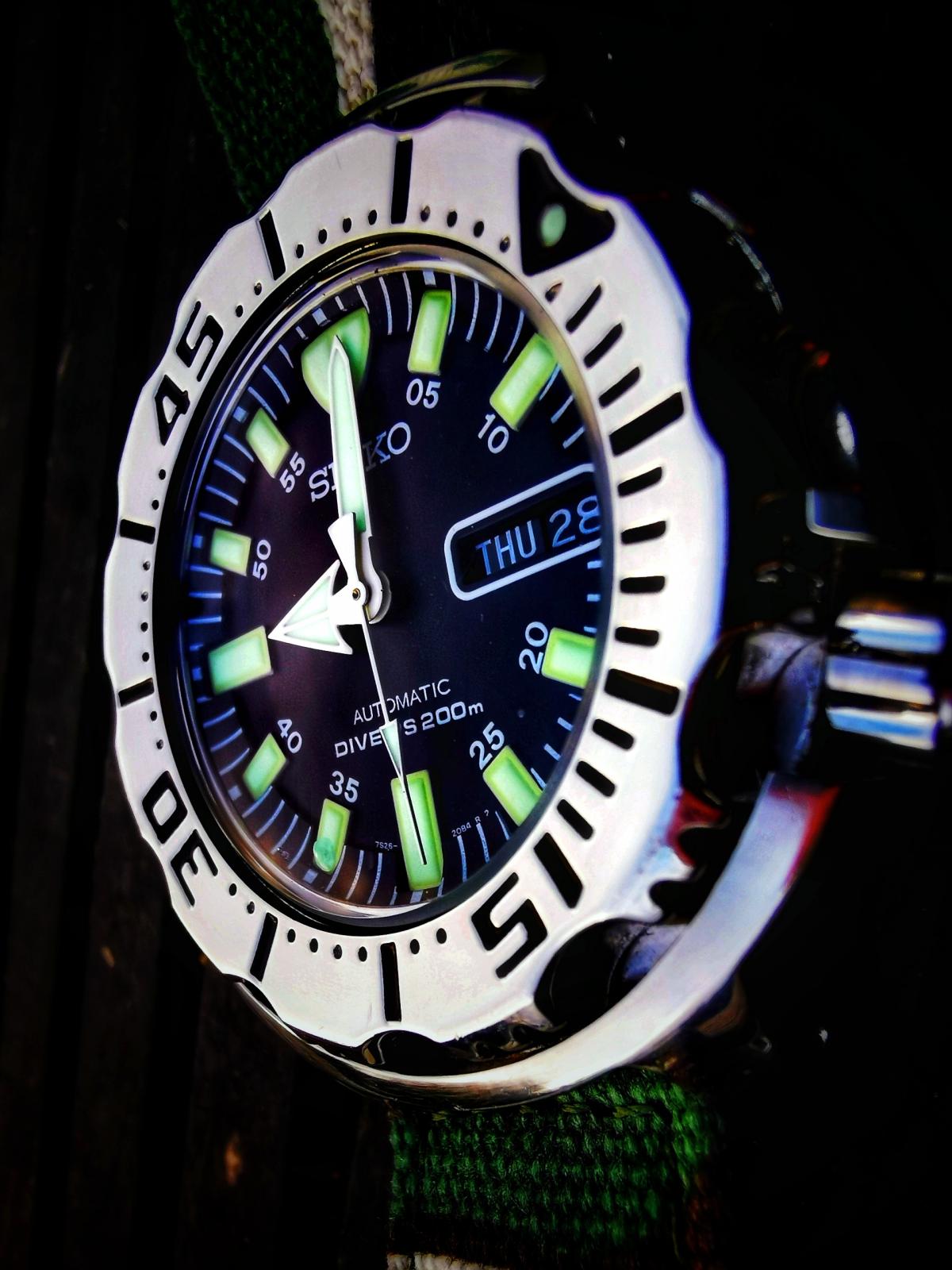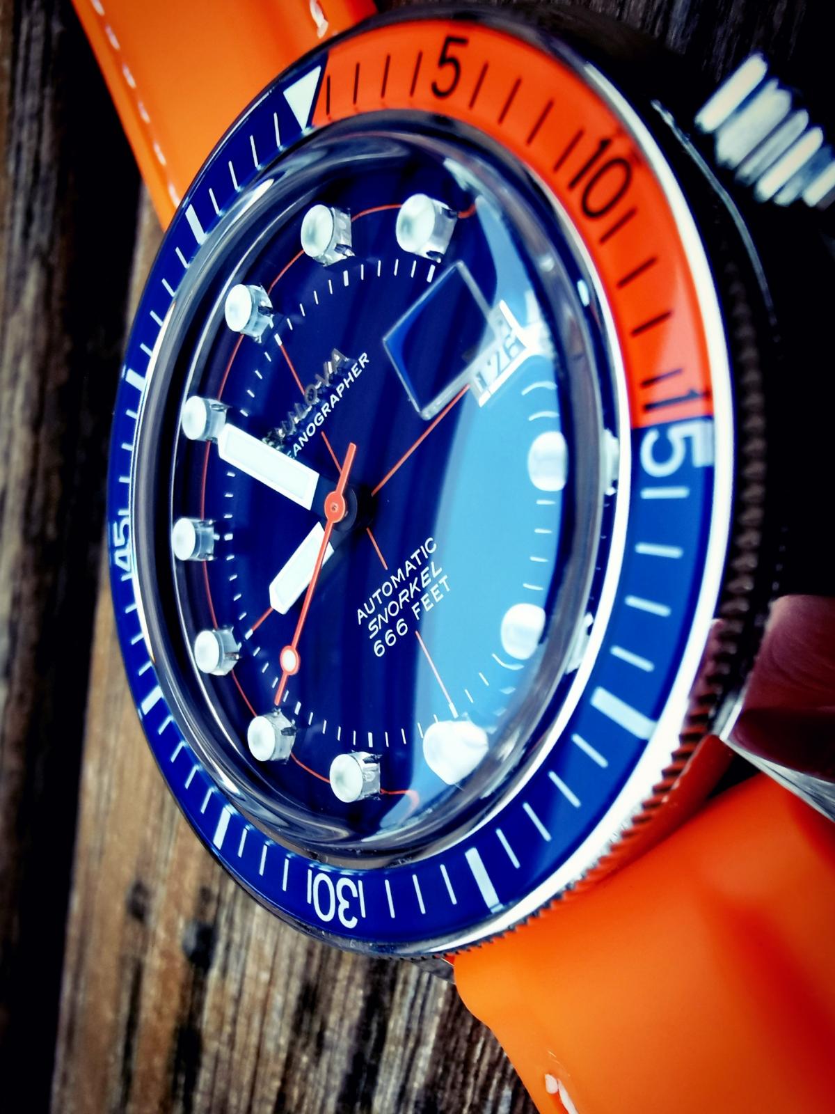 To jest Independent Watch One po modzie poprzez zmianę tarczy na trawioną przez Leszka (banned on this forum), nity, luma i pierścień minutowy to moja własna fantazja. Koperta 44 mm b/k, szkło szafir, bezel ceramika z lumą, dekielek na śrubki, WR 300, pasek struś od Gripena