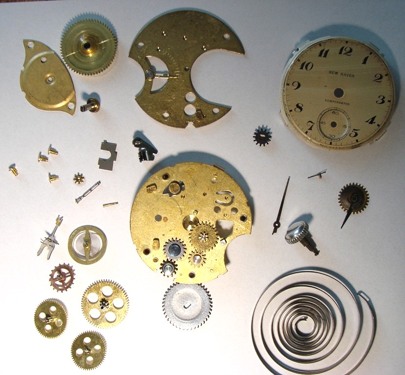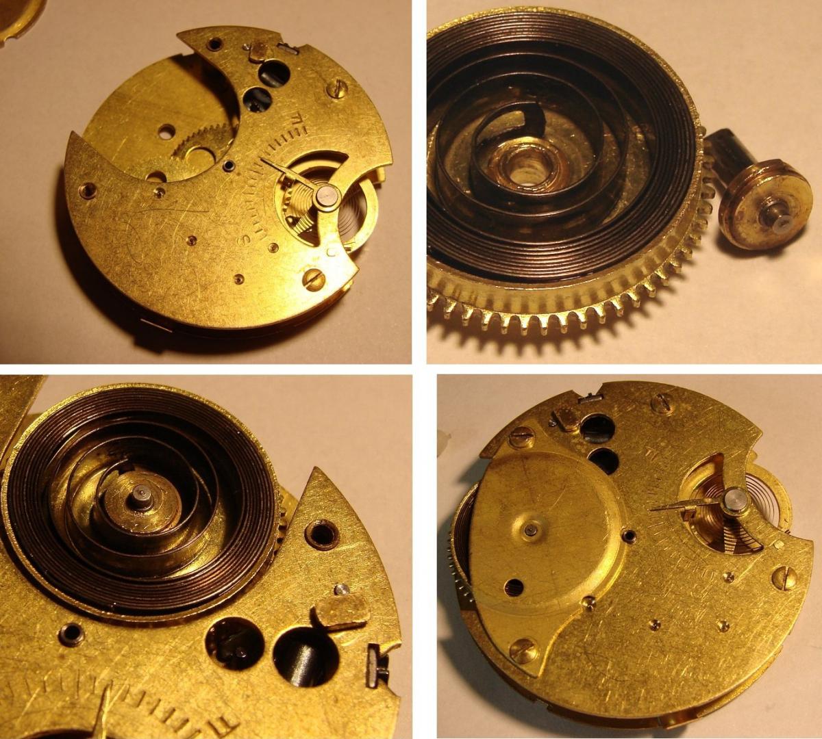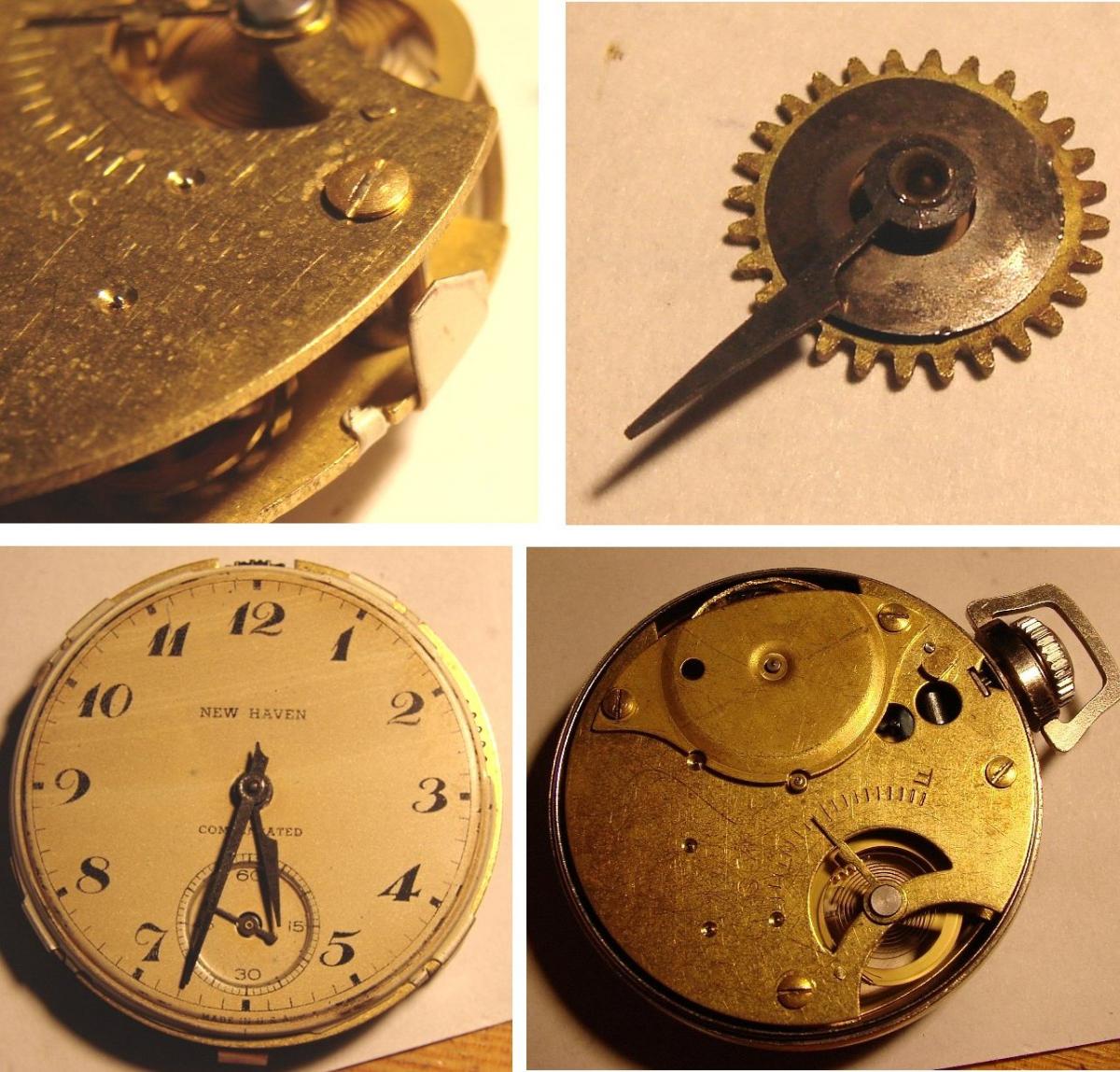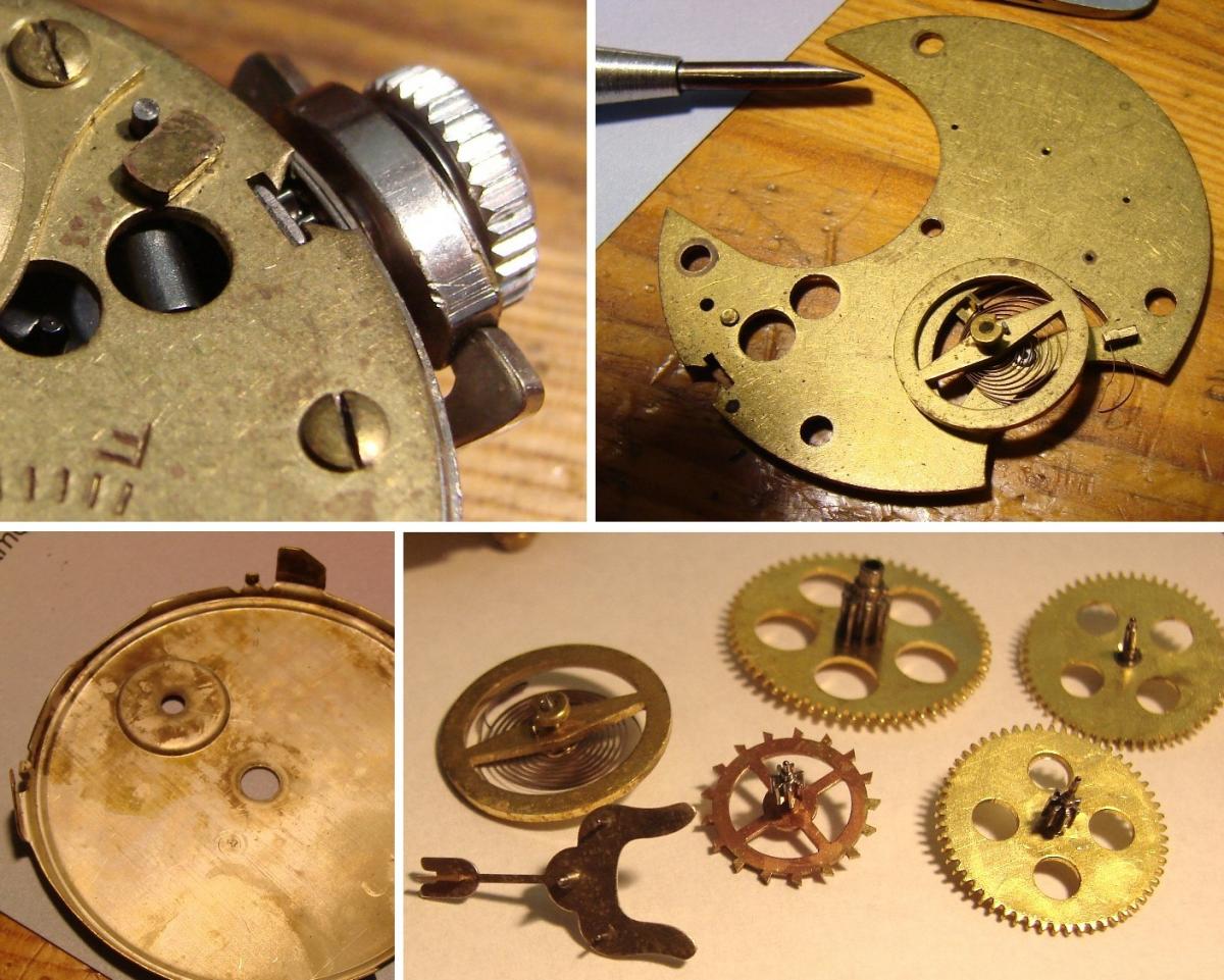pmwas 9409 #1 Napisano 2 Maja 2017 Witajcie!!! Podtytuł nawiązuje oczywiście do prezentowanego przeze mnie niedawno Roskopfa.Dokładnie tak, jak w Szwajcarii, również w USA poszukiwano metod masowej produkcji zegarka, który mógłby zapełnić dolne segmenty rynku i być dostępnym praktycznie dla każdego. Pierwsza próbę wyprodukowania bardzo taniego zegarka podjęła firma Waterbury. Zegarki wyposażone były w wychwyt podwójny (duplex) i były zupełnie przyzwoitej jakości.Niestety po jakims czasie przylgnęła do nich "łatka" tandety i ludzie przestali je kupować, choć ogólnie powstało ich (pod markami Waterbury i New England Watch Co) całkiem sporo. Ciekawe też, ze jakolwiek uważano je za tandetne, era prawdziwej tandety miała dopiero nadejść. Myślę, że idąc dalej w temacie tanich zegarków zacząć należy od fabryki braci Ingersoll, która w latach 1880-tych zaczęła produkować słynne zegarki za dolara (dollar watch), na początku zresztą kupując niewykończone mechanizmy od wspomnianej fabryki z Waterbury.W tym czasie swoje niedrogie (i początkowo ogromne) zegarki z mechanizmem podobnym do tych stosowanych w małych budzikach wypuściła fabryka w New Haven. W 20 wieku na placu boju pozostało trzech producentów - Ingersoll (później Timex), New Haven i Westclox.Produkowali oni spore ilosci bardzo tanich zegarków taki naręcznych, jak i kieszonkowych, bijąc co raz to nowe rekordy w dziedzinie cięcia kosztów produkcji. Nie muszę mówić, że jakość produktów odbiegała od tego, co oferowali producenci od klasy średniej wzwyż, ale miały one pewne zalety - po pierwsze - chodziły, po drugie - znacznie trudniej było je uszkodzić... Zdjęcie pokazuje nieco "bogatszą" wersję Ingersolla (marka Kelton) z kopertą pokrytą żółtą powłoką (nie wiem, czy to cienkie złocenie, czy jakiś substytut). Zżółkłe szkło spowodowało korozję wskazówek - niestety niełatwo je wymienić, bo w tych zegarkach "szkło" to plastikowa wytłoczka, którą wkłada się do koperty i dociska mechanizmem i deklem. Mechanizmy Ingersolla i New Haven wyglądały bardzo podobnie - fatalnie wykończone mosiężne płyty, 0 kamieni i kołkowy wychwyt.Ruhla przy tym to cudeńko, choc zdarzały się też mniej "wymiotnie" wykończone "dolarówki" z w/w fabryk. I pora na "danie główne" - kieszonkowy zegarek New Haven Watch Co: Tu w częściach... Zegarek mam już dobrą chwilę, ale nie potrafiłem wyjąć z niego wałka.Okazuje się, że najpierw trzeba przekręcić prostokątną blaszkę, odsłaniając czop tiretu: Aby wyjąć wałek trzeba ten czop wyciągnąć, nie wcisnąć.Z innych szczegółów - widzimy balans przypięty do górnej płyty, tarczę w postaci metalowej wytłoczki i przekładnię chodu z kołkowym wychwytem. Wiele części zanitowano na stałe na głównej płycie, uwagę zwracają też mosiężne śrubki...Uwaga też na włos - jest bardzo miękki i łatwo się odkształca. Mój zegarek miał urwany haczyk w bębnie... Najprościej byłoby zrobić nowy obok, ale nie ma takiego narzędzia, więc zainstalowałem stalowy nit w ściance.Gdyby nie uślizg narzędzia (musiałem prostować ściankę ) powiedziałbym, że wyszło nieźle...Normalnie gdy znajduję wyłamany hak, po prostu nawiercam dwie dziurki i instaluję sprężynę z końcem w kształcie litery T, ale w tym zegarku bęben nie posiada dekielka. Zegarek składam do góry nogami, bo balans należy przypiąc do górnej płyty.Składanie jest dośc łatwe, trzeba tylko pamiętac o tirecie i zębatce naciągu, bo potem się go nie włoży.Sam tiret przesuwa zaznaczone strzałką kółko w pozycję do nastawiania lub nakręcania... Mostek bębna jest cienki i miękki - katastrofa Pora obrócić mechanizm na drugą stronę...Jak zobaczycie - łożysko balansu od strony tarczy jest - na wzór mechanizmów zegarowych - regulowane. Wkręcając je głębiej lub wykręcając regulujemy luz pionowy osi balansu. Koło zapadkowe jest trzymane na miejscu przez dwie prostokątne blaski - do demontażu wystarczy przesunąć tylko jedną z nich.Oś centralną najlepiej montować na nabijarce, bo mała mosiężna zębatka przekładni wskazań daje spory opór przy nabijaniu. Teraz zostaje już tylko - mocowana zaginanymi nóżkami - tarcza, wskazówki i można z powrotem włożyć mechanizm do koperty. Wskazówki godzinowej nie udało mi się sciągnąc z jej koła - zapieczona Zegarek ma bardzo typowy wygląd "dolarówki" - z kilometra widać, z czym mamy do czynienia...Koperta, oczywiście, chromowana. Trzeba powiedzieć, ze jak na dolarówkę nawet starannie go wykończyli... I raz jeszcze mechanizm. Jakość tego urządzenia to istny koszmar - mało kto robi tak niskiej jakości zegarki. Krok dalej poszli już tylko w Westclox'ie, nitując płyty ze sobą.Trzeba jednak powiedzieć, że jest to również absolutnie mistrzowski projekt - działający zegarek z remontoirem z tak małą ilością części - to robi wrażenie! Warto również zauważyć, że przy swoich wadach, wychwyt kołkowy wciąż jest wychwytem kotwicowym i pozwala uzyskać przyzwoitą dokładność chodu. Ciekawe? Trochę Cóż, co by nie powiedzieć, ten New Haven jest i pozostanie tandetnym zegarkiem za dolara.Ale warto było zajrzeć!Miłego dnia! 0 Miłego dnia! Udostępnij tę odpowiedź Odnośnik do odpowiedzi Udostępnij na innych stronach