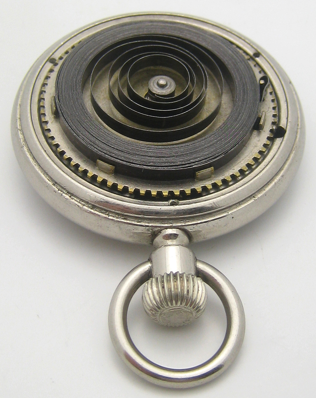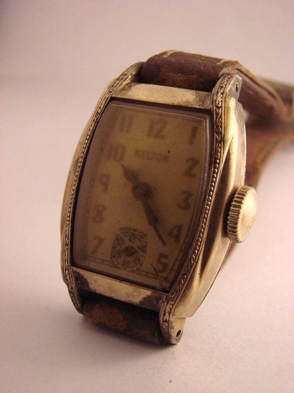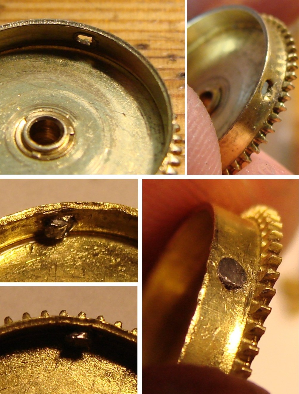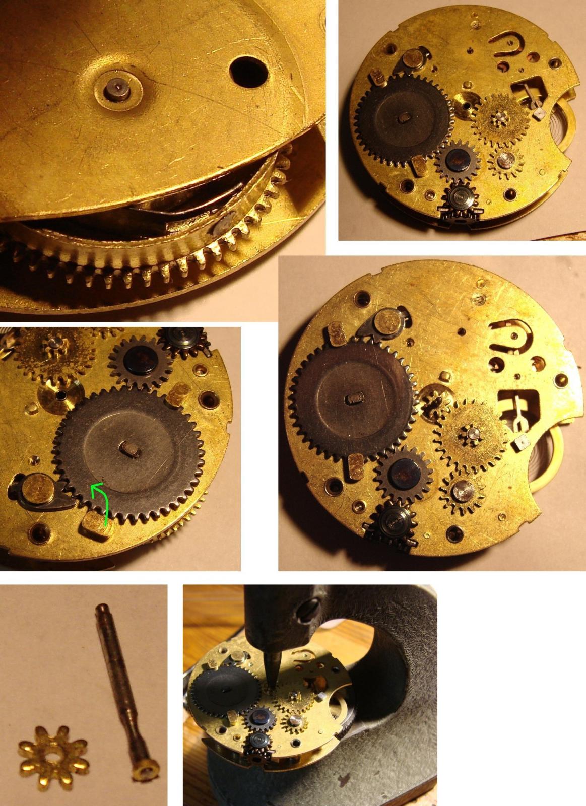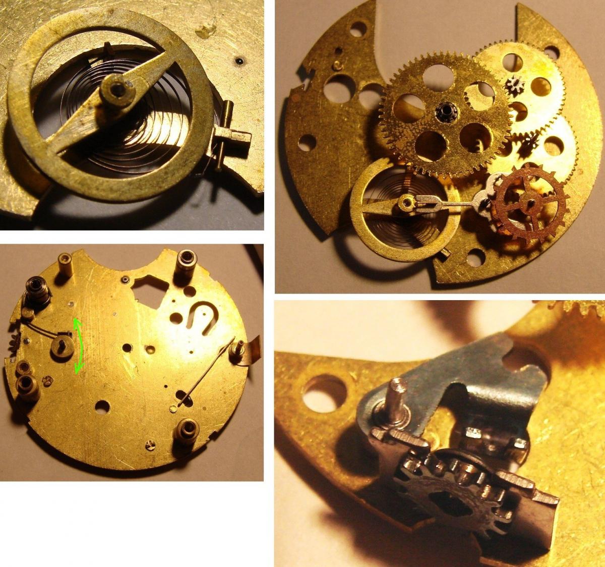 pmwas 9409 #1 Napisano 2 Maja 2017 Witajcie!!! Podtytuł nawiązuje oczywiście do prezentowanego przeze mnie niedawno Roskopfa.Dokładnie tak, jak w Szwajcarii, również w USA poszukiwano metod masowej produkcji zegarka, który mógłby zapełnić dolne segmenty rynku i być dostępnym praktycznie dla każdego. Pierwsza próbę wyprodukowania bardzo taniego zegarka podjęła firma Waterbury. Zegarki wyposażone były w wychwyt podwójny (duplex) i były zupełnie przyzwoitej jakości.Niestety po jakims czasie przylgnęła do nich "łatka" tandety i ludzie przestali je kupować, choć ogólnie powstało ich (pod markami Waterbury i New England Watch Co) całkiem sporo. Ciekawe też, ze jakolwiek uważano je za tandetne, era prawdziwej tandety miała dopiero nadejść. Myślę, że idąc dalej w temacie tanich zegarków zacząć należy od fabryki braci Ingersoll, która w latach 1880-tych zaczęła produkować słynne zegarki za dolara (dollar watch), na początku zresztą kupując niewykończone mechanizmy od wspomnianej fabryki z Waterbury.W tym czasie swoje niedrogie (i początkowo ogromne) zegarki z mechanizmem podobnym do tych stosowanych w małych budzikach wypuściła fabryka w New Haven. W 20 wieku na placu boju pozostało trzech producentów - Ingersoll (później Timex), New Haven i Westclox.Produkowali oni spore ilosci bardzo tanich zegarków taki naręcznych, jak i kieszonkowych, bijąc co raz to nowe rekordy w dziedzinie cięcia kosztów produkcji. Nie muszę mówić, że jakość produktów odbiegała od tego, co oferowali producenci od klasy średniej wzwyż, ale miały one pewne zalety - po pierwsze - chodziły, po drugie - znacznie trudniej było je uszkodzić... Zdjęcie pokazuje nieco "bogatszą" wersję Ingersolla (marka Kelton) z kopertą pokrytą żółtą powłoką (nie wiem, czy to cienkie złocenie, czy jakiś substytut). Zżółkłe szkło spowodowało korozję wskazówek - niestety niełatwo je wymienić, bo w tych zegarkach "szkło" to plastikowa wytłoczka, którą wkłada się do koperty i dociska mechanizmem i deklem. Mechanizmy Ingersolla i New Haven wyglądały bardzo podobnie - fatalnie wykończone mosiężne płyty, 0 kamieni i kołkowy wychwyt.Ruhla przy tym to cudeńko, choc zdarzały się też mniej "wymiotnie" wykończone "dolarówki" z w/w fabryk. I pora na "danie główne" - kieszonkowy zegarek New Haven Watch Co: Tu w częściach... Zegarek mam już dobrą chwilę, ale nie potrafiłem wyjąć z niego wałka.Okazuje się, że najpierw trzeba przekręcić prostokątną blaszkę, odsłaniając czop tiretu: Aby wyjąć wałek trzeba ten czop wyciągnąć, nie wcisnąć.Z innych szczegółów - widzimy balans przypięty do górnej płyty, tarczę w postaci metalowej wytłoczki i przekładnię chodu z kołkowym wychwytem. Wiele części zanitowano na stałe na głównej płycie, uwagę zwracają też mosiężne śrubki...Uwaga też na włos - jest bardzo miękki i łatwo się odkształca. Mój zegarek miał urwany haczyk w bębnie... Najprościej byłoby zrobić nowy obok, ale nie ma takiego narzędzia, więc zainstalowałem stalowy nit w ściance.Gdyby nie uślizg narzędzia (musiałem prostować ściankę ) powiedziałbym, że wyszło nieźle...Normalnie gdy znajduję wyłamany hak, po prostu nawiercam dwie dziurki i instaluję sprężynę z końcem w kształcie litery T, ale w tym zegarku bęben nie posiada dekielka. Zegarek składam do góry nogami, bo balans należy przypiąc do górnej płyty.Składanie jest dośc łatwe, trzeba tylko pamiętac o tirecie i zębatce naciągu, bo potem się go nie włoży.Sam tiret przesuwa zaznaczone strzałką kółko w pozycję do nastawiania lub nakręcania... Mostek bębna jest cienki i miękki - katastrofa Pora obrócić mechanizm na drugą stronę...Jak zobaczycie - łożysko balansu od strony tarczy jest - na wzór mechanizmów zegarowych - regulowane. Wkręcając je głębiej lub wykręcając regulujemy luz pionowy osi balansu. Koło zapadkowe jest trzymane na miejscu przez dwie prostokątne blaski - do demontażu wystarczy przesunąć tylko jedną z nich.Oś centralną najlepiej montować na nabijarce, bo mała mosiężna zębatka przekładni wskazań daje spory opór przy nabijaniu. Teraz zostaje już tylko - mocowana zaginanymi nóżkami - tarcza, wskazówki i można z powrotem włożyć mechanizm do koperty. Wskazówki godzinowej nie udało mi się sciągnąc z jej koła - zapieczona Zegarek ma bardzo typowy wygląd "dolarówki" - z kilometra widać, z czym mamy do czynienia...Koperta, oczywiście, chromowana. Trzeba powiedzieć, ze jak na dolarówkę nawet starannie go wykończyli... I raz jeszcze mechanizm. Jakość tego urządzenia to istny koszmar - mało kto robi tak niskiej jakości zegarki. Krok dalej poszli już tylko w Westclox'ie, nitując płyty ze sobą.Trzeba jednak powiedzieć, że jest to również absolutnie mistrzowski projekt - działający zegarek z remontoirem z tak małą ilością części - to robi wrażenie! Warto również zauważyć, że przy swoich wadach, wychwyt kołkowy wciąż jest wychwytem kotwicowym i pozwala uzyskać przyzwoitą dokładność chodu. Ciekawe? Trochę Cóż, co by nie powiedzieć, ten New Haven jest i pozostanie tandetnym zegarkiem za dolara.Ale warto było zajrzeć!Miłego dnia! 0 Miłego dnia! Udostępnij tę odpowiedź Odnośnik do odpowiedzi Udostępnij na innych stronach