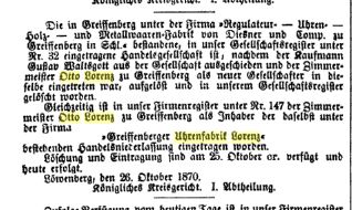 janekp 516 #2 Napisano 6 Grudnia 2017 W roku 1870 mistrz (ciesielski/stolarski) Otto Lorenz wykupił w Gryfowie Śląskim fabrykę "Regulateur - Uhren - Holz und Metalwaarenfabrik Diesner und Comp" i załozył firmę "Greiffenberger Uhrenfabik Lorenz". Firma istniała jeszcze w urzędowych spisach w roku 1876.FireShot Screen Capture #363 - 'Königlich Preußischer Staats-Anzeiger_ 1870 Otto Lorenz Greffenberg.jpg FireShot Screen Capture #364 - 'Die Einrichtungen für die Wohlfahrt der Arbeiter d_' - books_google_pl_books_id=GHCbDd0-hqkC&pg=RA1-PA54&dq=Greiffenb.jpgMaly trop -Ernst Anders Gottlieb 1869 regulatorenfabrik Greifenberg ktora wchodzila w sklad Silesia ?http://www.uhrmacherverzeichnis.de/index.php?request=ClockMaker/showDetails&id=275 Uhrmacher: Anders, Ernst GottliebName AndersVorname Ernst GottliebWohnort GreiffenbergGeboren 1831 Oberfalkenhain, Kr. Schönau, SchlesienSonstiges ab 1872 Fabrik f. Uhrmacherei + Feinmechanik in Silberberg, Kr. FrankensteinPortrait (lt. Kristina Schüttler hat ein Enkel des UM notiert) ab 1852 in Lehre b Eduard Eppner, Lähn, dort blieb er bis 1866, 1869 mit Regulatorenfab-rik selbst. in Greiffenberg + bis 1872 Mitglied bei Silesia, Freiburg, ab 1872 Fabrik f. Uhrmacherei + Feinmechanik in Silberberg, Kr. Frankenstein, erl. Teilarbeiten f. Eppner, der dort ansäßig warBedeutung FirmaJahr 1831Ort GreiffenbergProvinz BrandenburgLand DeutschlandU-Region OstdeutschlandU-Typ(en) Uhrenfabrik 0 Znane są tysiące sposobów zabijania czasu,ale nikt nie wie, jak go wskrzesić. Udostępnij tę odpowiedź Odnośnik do odpowiedzi Udostępnij na innych stronach