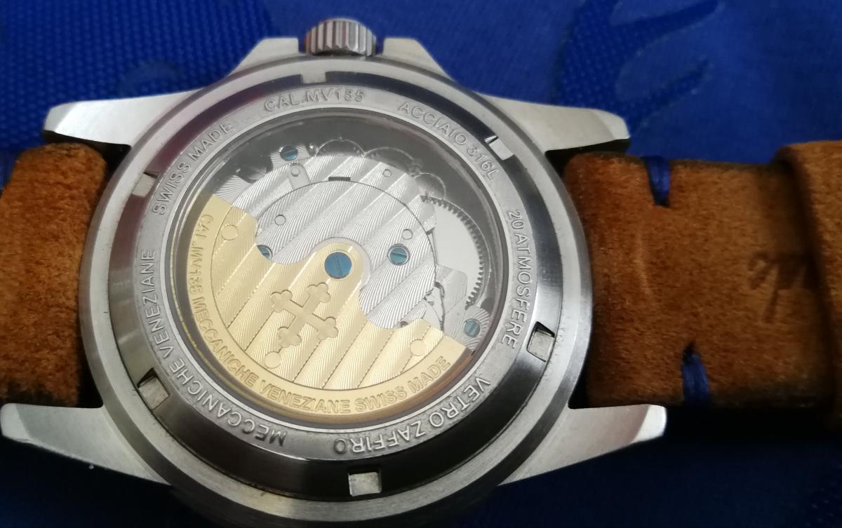 Na Bazarku ląduję zegarek kupiony kilka lat temu również tutaj, na Bazarku. Meccaniche Veneziane Redentore w rozmiarze 36 mm. Jeszcze pod starą nazwą i jeszcze w wersji ze szwajcarskim mechanizmem, który w terminologii Maccaniche Veneziane nosi nazwę caliber MV285, a w praktyce to szwajcarski klon ETA-2824. W tym wypadku STP 1-11. Jest ładnie zdobiony i z pozłacanym (tak w każdym razie słyszałem), customowym wahnikiem. Venezianico Redentore, które są dostępne w obecnej ofercie producenta nie mają ani przeszklonego dekla ani zdobionego, szwajcarskiego mechanizmu. W środku obecnych wypustów pracują Seiko NH36, więc łatwo się domyślić, że przeszklony dekiel nie byłby w tym wypadku zaletą.