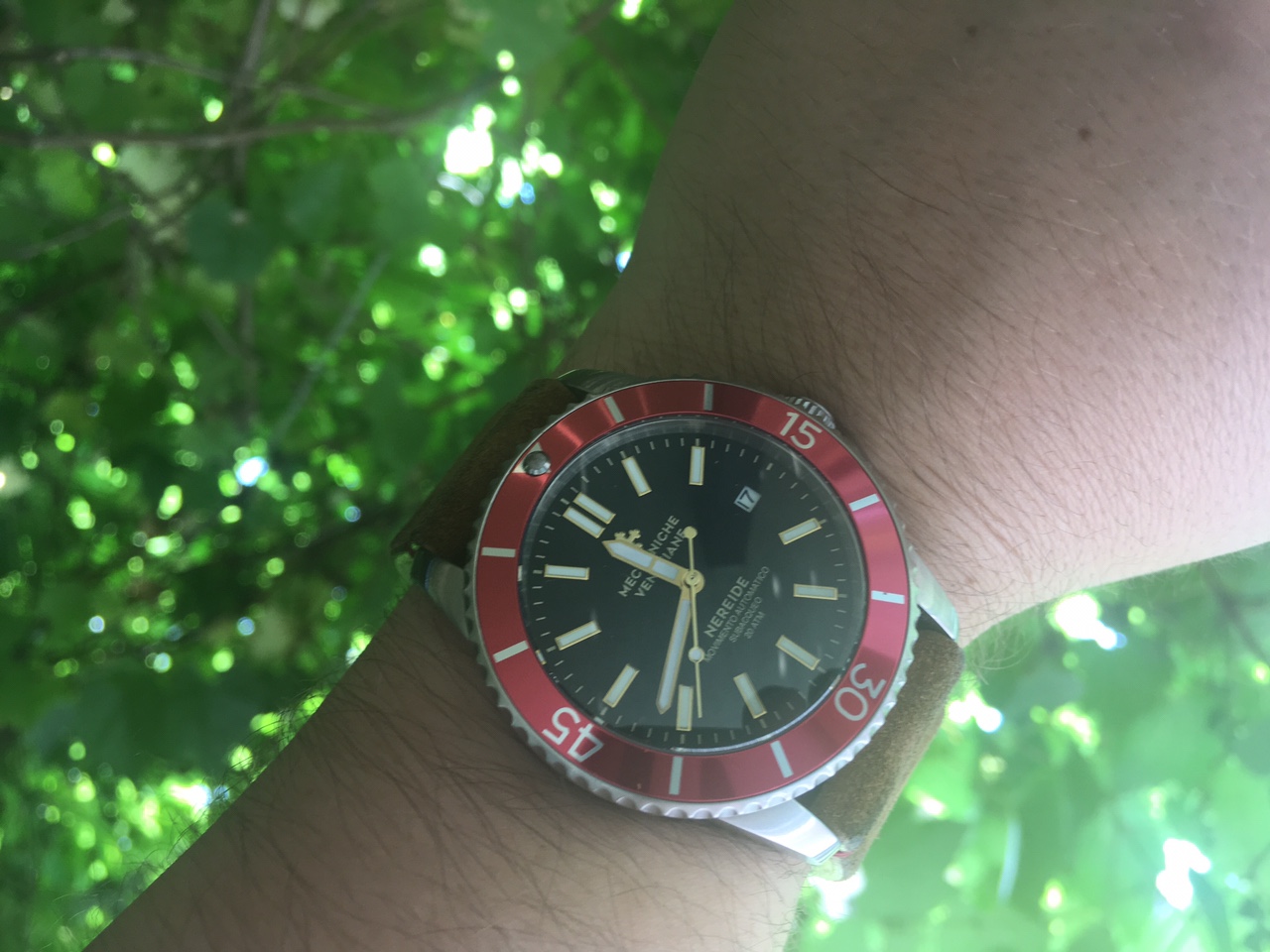 Na Bazarku ląduję zegarek kupiony kilka lat temu również tutaj, na Bazarku. Meccaniche Veneziane Redentore w rozmiarze 36 mm. Jeszcze pod starą nazwą i jeszcze w wersji ze szwajcarskim mechanizmem, który w terminologii Maccaniche Veneziane nosi nazwę caliber MV285, a w praktyce to szwajcarski klon ETA-2824. W tym wypadku STP 1-11. Jest ładnie zdobiony i z pozłacanym (tak w każdym razie słyszałem), customowym wahnikiem. Venezianico Redentore, które są dostępne w obecnej ofercie producenta nie mają ani przeszklonego dekla ani zdobionego, szwajcarskiego mechanizmu. W środku obecnych wypustów pracują Seiko NH36, więc łatwo się domyślić, że przeszklony dekiel nie byłby w tym wypadku zaletą.