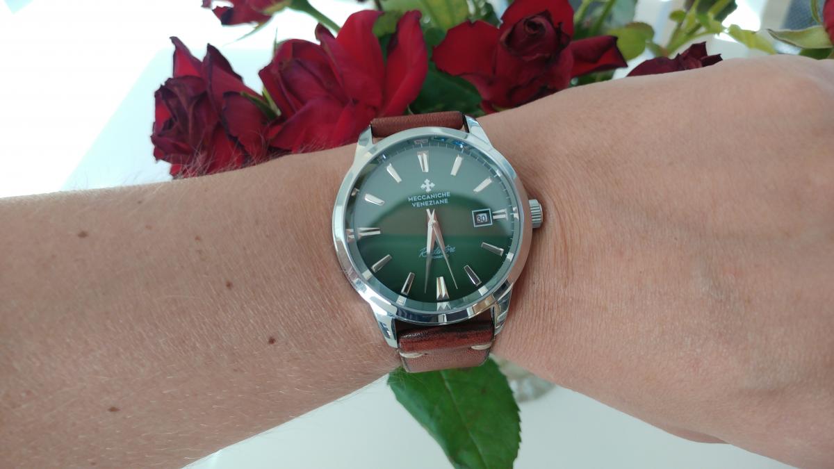 Na Bazarku ląduję zegarek kupiony kilka lat temu również tutaj, na Bazarku. Meccaniche Veneziane Redentore w rozmiarze 36 mm. Jeszcze pod starą nazwą i jeszcze w wersji ze szwajcarskim mechanizmem, który w terminologii Maccaniche Veneziane nosi nazwę caliber MV285, a w praktyce to szwajcarski klon ETA-2824. W tym wypadku STP 1-11. Jest ładnie zdobiony i z pozłacanym (tak w każdym razie słyszałem), customowym wahnikiem. Venezianico Redentore, które są dostępne w obecnej ofercie producenta nie mają ani przeszklonego dekla ani zdobionego, szwajcarskiego mechanizmu. W środku obecnych wypustów pracują Seiko NH36, więc łatwo się domyślić, że przeszklony dekiel nie byłby w tym wypadku zaletą.