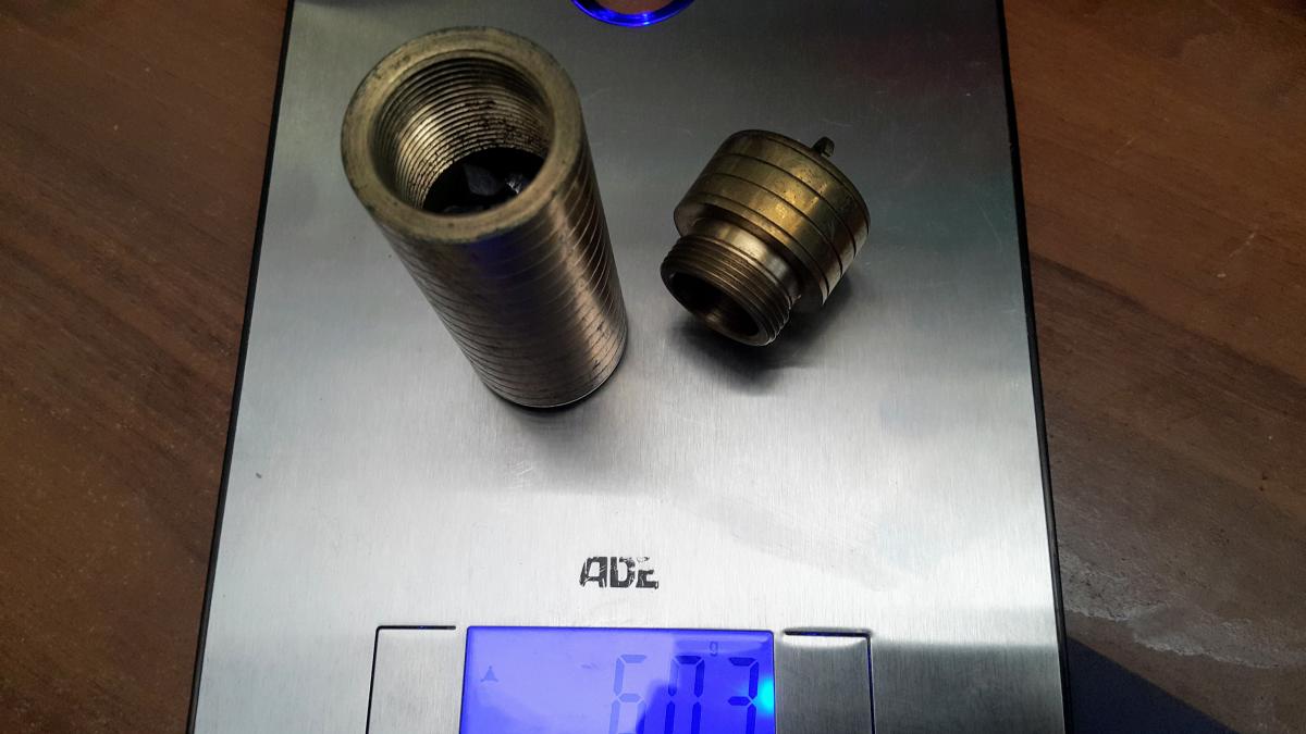 Zważyłem wagi Reschom przytroczone, ważą po jakieś 1240 gramów. Ale...wagi rzecz nabyta. A teraz prezentacja wynalazku podwieszonego do Rescha karmnika. Waga regulowana. Koszt wytworzenia przez naprawiacza musiał być spory: przecięcie takiego pręta, wywiercenie, nagwintowanie. Wreszcie szlaczki ;) I w środku kęsy ołowiu - quantum satis ;)