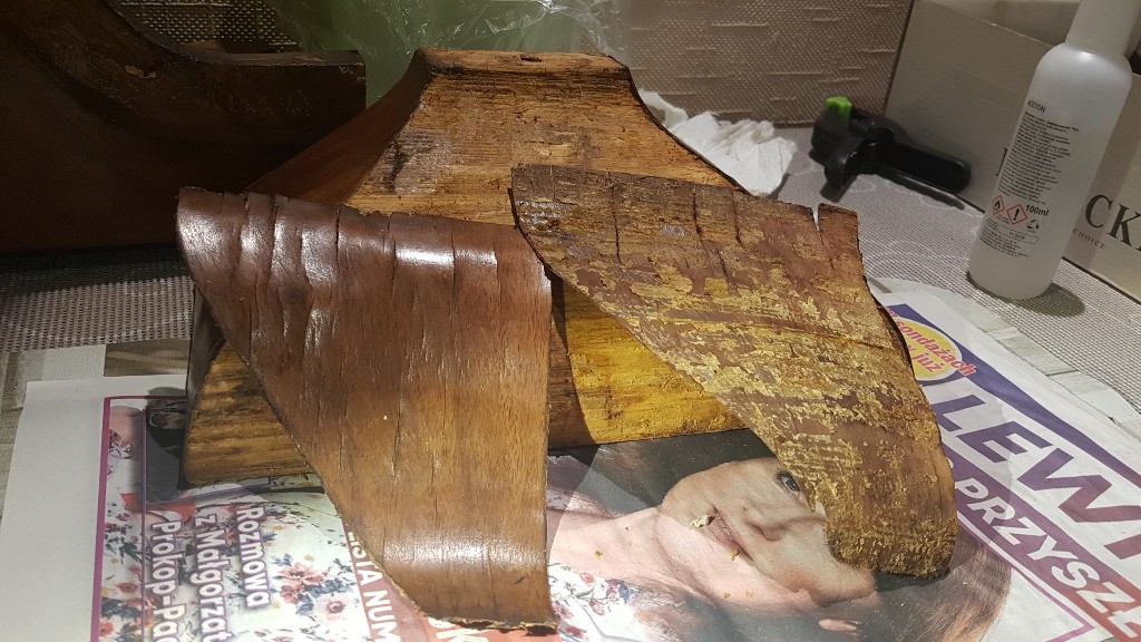 Yodek 2548 #4772 Napisano 11 Października 2019 Czyszczenie ze starego kleju - moczyłam i skrobałam, jak Bartek kazał A że już fornir mokry to myślę - raz kozie śmierć. Nie pytajcie jak kleiłam bo pospadacie z krzeseł.Teraz zaklejanie tych 0,5 mm spękań forniru. 0 Udostępnij tę odpowiedź Odnośnik do odpowiedzi Udostępnij na innych stronach