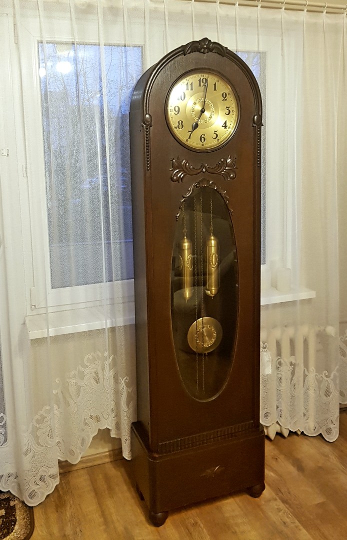Yodek 2548 #1959 Napisano 18 Lutego 2019 (edytowane) Mam takiego cudoka z wahadłem na wąskim, składanym pasku metalowym, mechanizm siedmiodniowy bez wodotrysków, zwykły Comtoise, ino stareńki. Niesłychanie dostojnie pracuje, wali w dzwon z powtórzeniem po 2 minutach, jedyny zegar, który słychać nawet w ogrodzie . Na początku się musiałem przyzwyczaić do nienachalnej urody, ale teraz nawet mi się podoba. A mechanizm i jego kowalskie wykonanie- miodzio! Kurza twarz...Fibo- jak Ty.., jak Ty piszesz co nie bądź to tak, że już-już mi "nienachalna" uroda się podoba!Walenie w dzwon odpada bo bliska szaleństwa byłabym.. Ale już mnie świerzbio ręce :-DTaki nienachalny, zmęczony, z wahadłem jak jęzor teściowej :-D Podobno XVIII/XIX wiek Edytowane 18 Lutego 2019 przez Yodek 0 Udostępnij tę odpowiedź Odnośnik do odpowiedzi Udostępnij na innych stronach