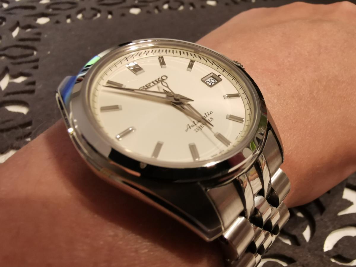 Raczej więc napiszę o tym, co mnie w tym zegarku spodobało, nie pomijając przy okazji tego, co bym w tym zegarku zmienił. Technicznie to koperta o średnicy 38 mm, o grubości ok. 13 mm oraz o wysokości (L2L) ok. 45 mm. Uważam, że grubość jest dość spora, jak na taką średnicę, ale przez kształt koperty, ten aspekt technicznej strony zegarka jest jak dla mnie pomijalny. Nie da się ukryć, że zegarek leży na nadgarstku po prostu fenomenalnie, w czym zasługa nie tylko dość kompaktowych wymiarów (głównie chodzi tu o L2L), ale także profilu koperty oraz płynnie wychodzących z niej uszu, które schodzą ku dołowi. Tym, co mnie urzekło w tym SARBie jest oczywiście kształt koperty. W tym przypadku nie mamy do czynienia z kopertą ciosaną jak tasakiem, ale z licznymi polerowanymi obłościami, które w mojej ocenie sprawiają wrażenie obcowania z zegarkiem ze zdecydowanie wyższej półki cenowej. Do tego te niesamowite płaszczyzny pokrywające uszy tego zegarka, które są satynowane. Takie zestawienie tworzy w mojej ocenie bardzo ciekawy efekt i sprawia, że patrzy się na kopertę tego zegarka z ogromną przyjemnością (przynajmniej ja tak mam). Luneta polerowana na wysoki połysk, do tego szafirowe (płaskie) szkło bez antyrefleksu oraz logowana koronka (wygrawerowana litera "S"). Dekielek transparentny - wedle mojej najlepszej wiedzy od spodu mamy szło mineralne (hardlex), przez który można podziwiać (to trochę na wyrost i jeszcze do tego wrócę) pracę mechanizmu - w tym przypadku to cenione 6R15, pracujące z częstotliwością 21 600 bph oraz zapewniające ok. 50 h rezerwy chodu.