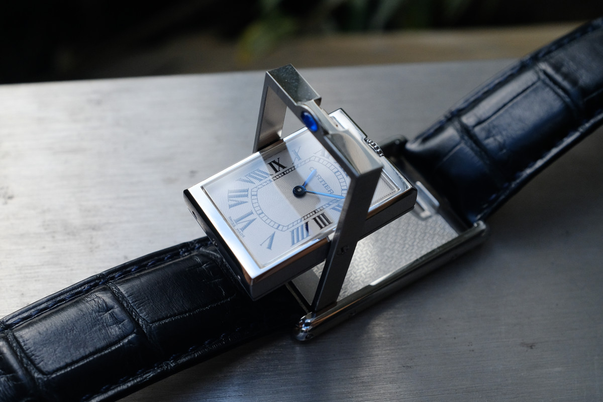 Cartier zaprezentował ten model w 1932 roku. Jednak odmiennie od Reverso miał umożliwić użytkownikowi obrócenie, postawienie na postawienie na blacie i traktowanie jako zegar biurkowy. Przyznaję, że zdarzało mi się go tak stawiać.