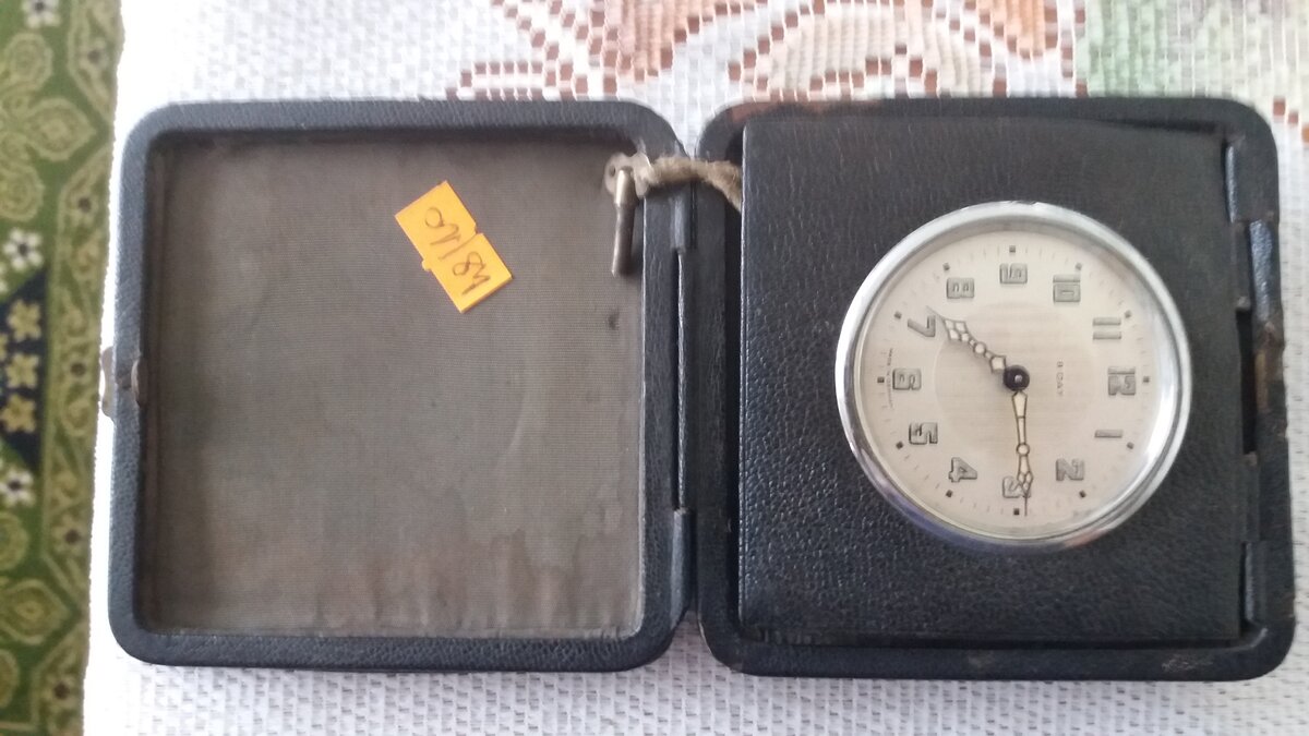 Zegarek 8 dniowy w etui. Na tarczy napis Made in Germany. Na płycie Germany. Na pokrywie od strony wewnętrznej informacja o naprawie z 19.08.1931 r. To nie jest budzik podróżny. Dlatego dałem go tematu chodziki miniaturowe.