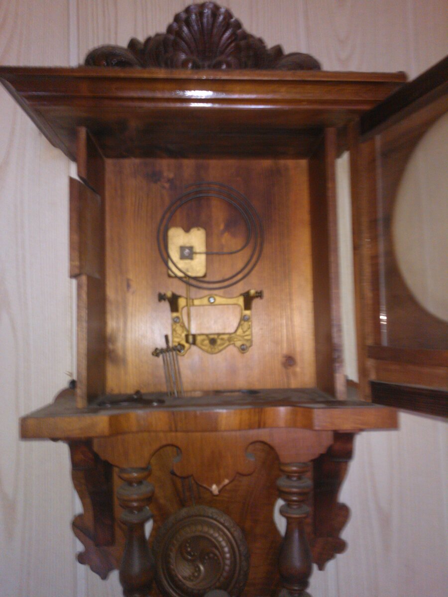 Tarcza / wahadło / ruszt / wskazówki / wieszak / tranporter - to raczej całość. Szkrzynia oryginalna i prawie w komplecie, boczny listek jest, ale się odkleił... naprawimy. Korona - hmmm... nie sądzę, żeby taka była od nowości. Całość przywalona warstwą kurzu... i korona też.